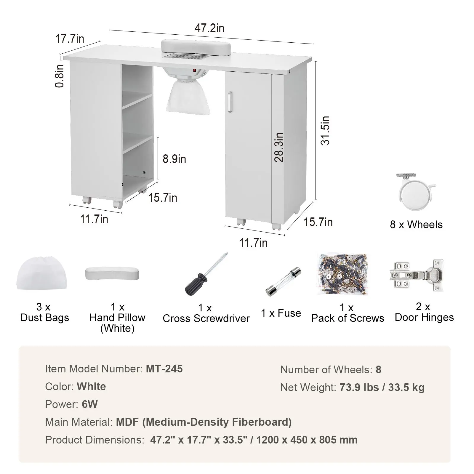 • High-Quality and Easy to Maintain: Crafted from premium medium-density fiberboard (MDF), our sturdy nail desk workstation is resistant to water and bending. It's the perfect blend of practicality and durability for long-lasting manicure service.