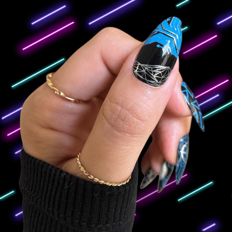 Plug into the grid with this electrifying plate. It features neon circuit lines, digital waveforms, and retro-futuristic motifs. Perfect for sci-fi arcade nail art. From geometric tech patterns to abstract digital symbols, every element is wired for bold, high-tech looks.