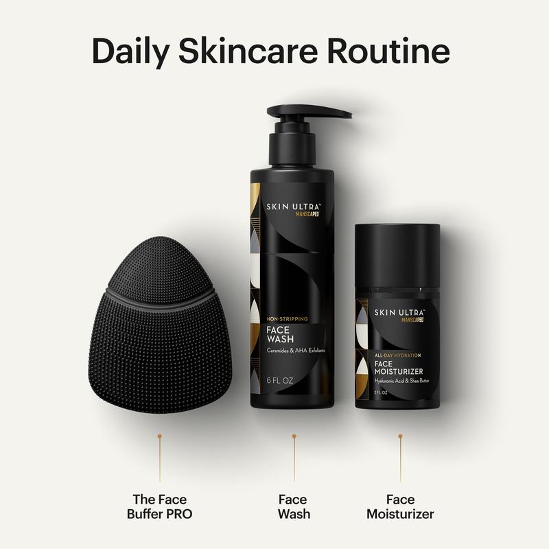 Upgrade your routine with the Skin Ultra Starter Kit — the ultimate trio to cleanse, exfoliate, and hydrate your skin. Start with the Face Buffer PRO, a high-performance electric face scrubber built for men’s skin, featuring three cleansing modes and soft silicone bristles that power through clogged pores in just 60 seconds. Follow up with the Skin Ultra Face Wash, a lightweight cleanser enriched with ceramides, AHA complex, and glycerin to gently exfoliate and hydrate while supporting a healthy skin barrier. Finish strong with the Skin Ultra Face Moisturizer, a non-greasy, shine-free formula packed with hyaluronic acid, vitamin E, and shea butter for all-day moisture and smooth, refreshed skin. Each product is dermatologist tested, paraben free, and features a clean, masculine scent with notes of fresh green and light woods. Everything you need to kickstart a simple, effective skincare routine — all in one kit.