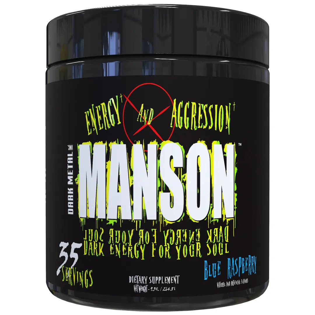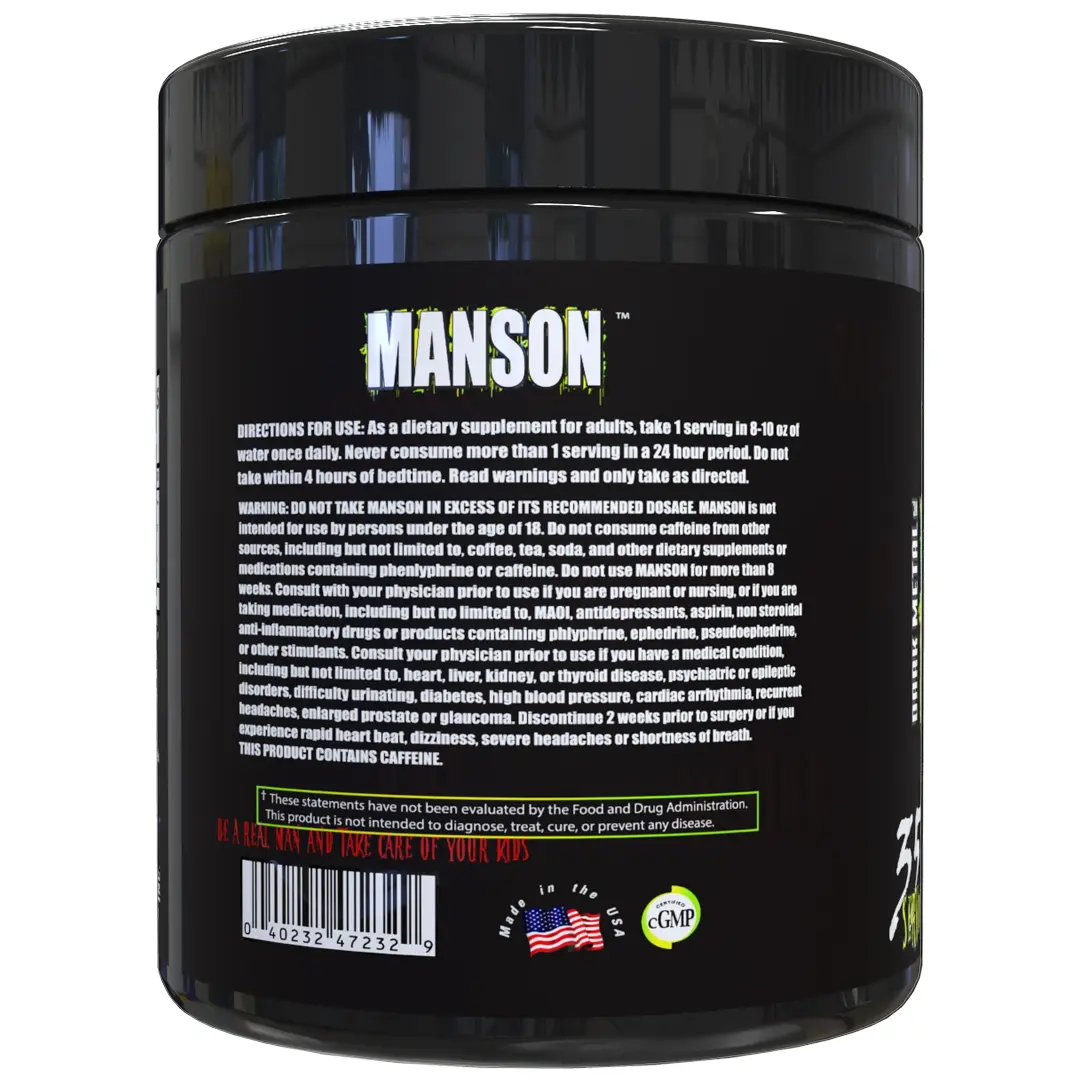 Manson by Dark Metal DARK ENERGY FOR YOUR SOUL - Manson is formulated to push your workouts to the absolute edge. With extreme mental focus, Manson is the top choice of any pre-workout. PROMOTES MUSCLE RECOVERY - With a unique formula, Manson helps promote muscle recovery while also aiding in building muscle. The Manson Family of pre-workout products will lead you to kill your workout - over and over again.  Three great-tasting formulas will make it obvious to you why Manson had so many adoring fans that we brought it back! #preworkout #preworkoutreview #carnitine #manson #insanelabz