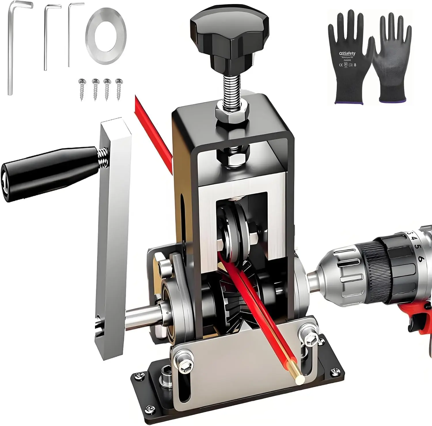 This versatile wire stripping machine operates with both manual and electric drills. It features a quick-change blade, making it efficient for various tasks. Ideal for scrap cable removal, this tool is a heavy-duty specialty hand tool. Perfect for cutting hardware, it ensures precise and effective wire stripping.