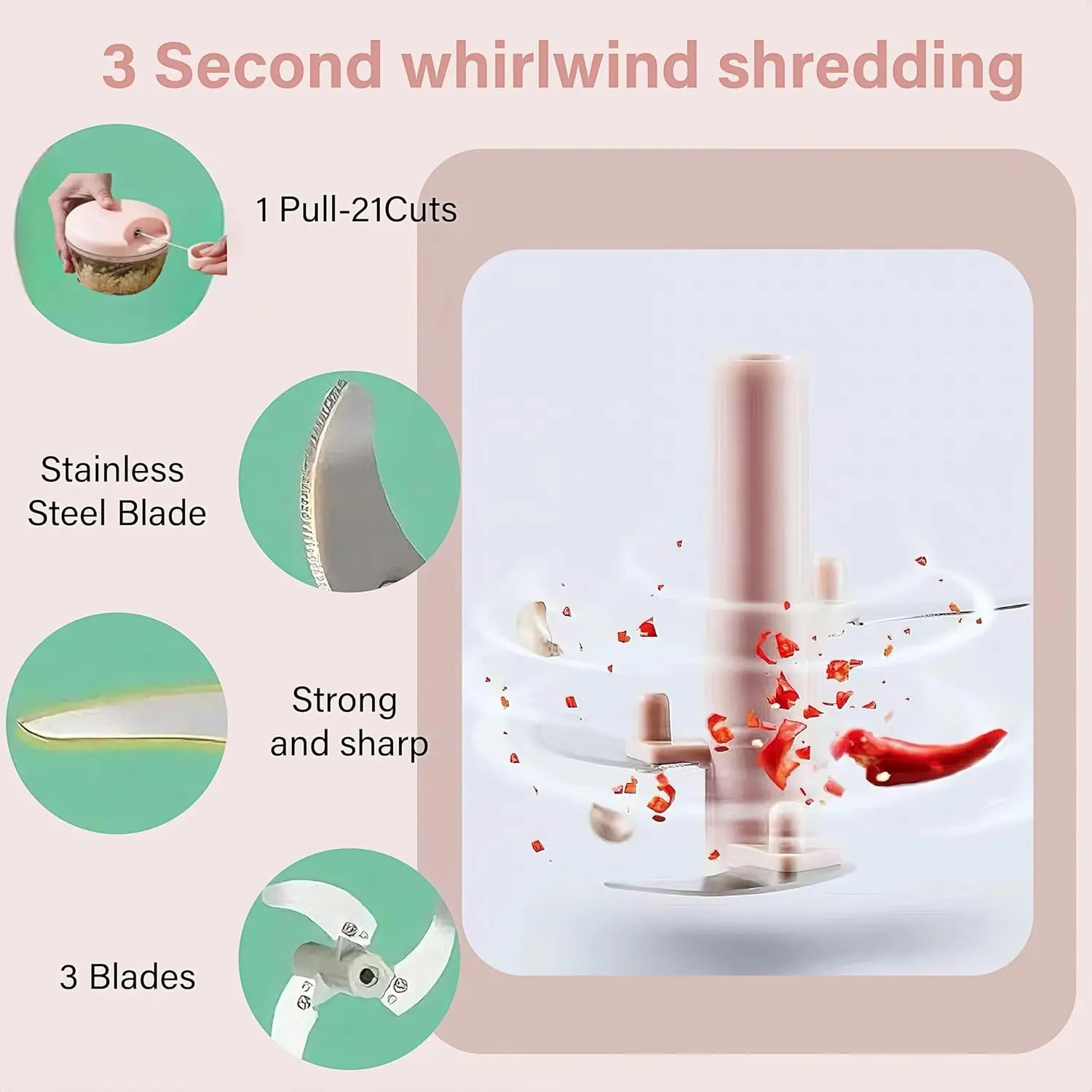 ·High-Quality Blades: Chopper vegetable cutter featuring durable stainless steel triple blades with multi-layer staggered distribution, ensuring even chopping without deformation or rust, offering long-lasting performance