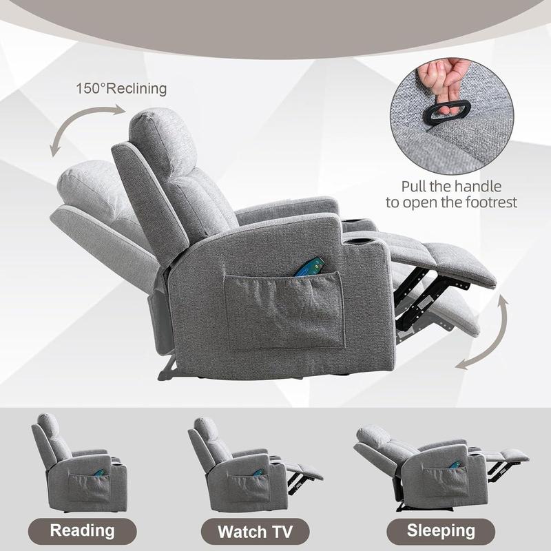 ·[Ample Storage]: The recliner chair is designed for your convenience. Featuring two side pockets and dual cup holders, which can provide ample storage for your essentials, making it perfect for relaxing with a book, watching a movie, or enjoying a drink. Recliner cup holders are strategically placed for easy access to your beverages. The cleverly designed storage solutions enhance usability, ensuring everything remains neatly arranged and accessible as you indulge in your moments of relaxation.