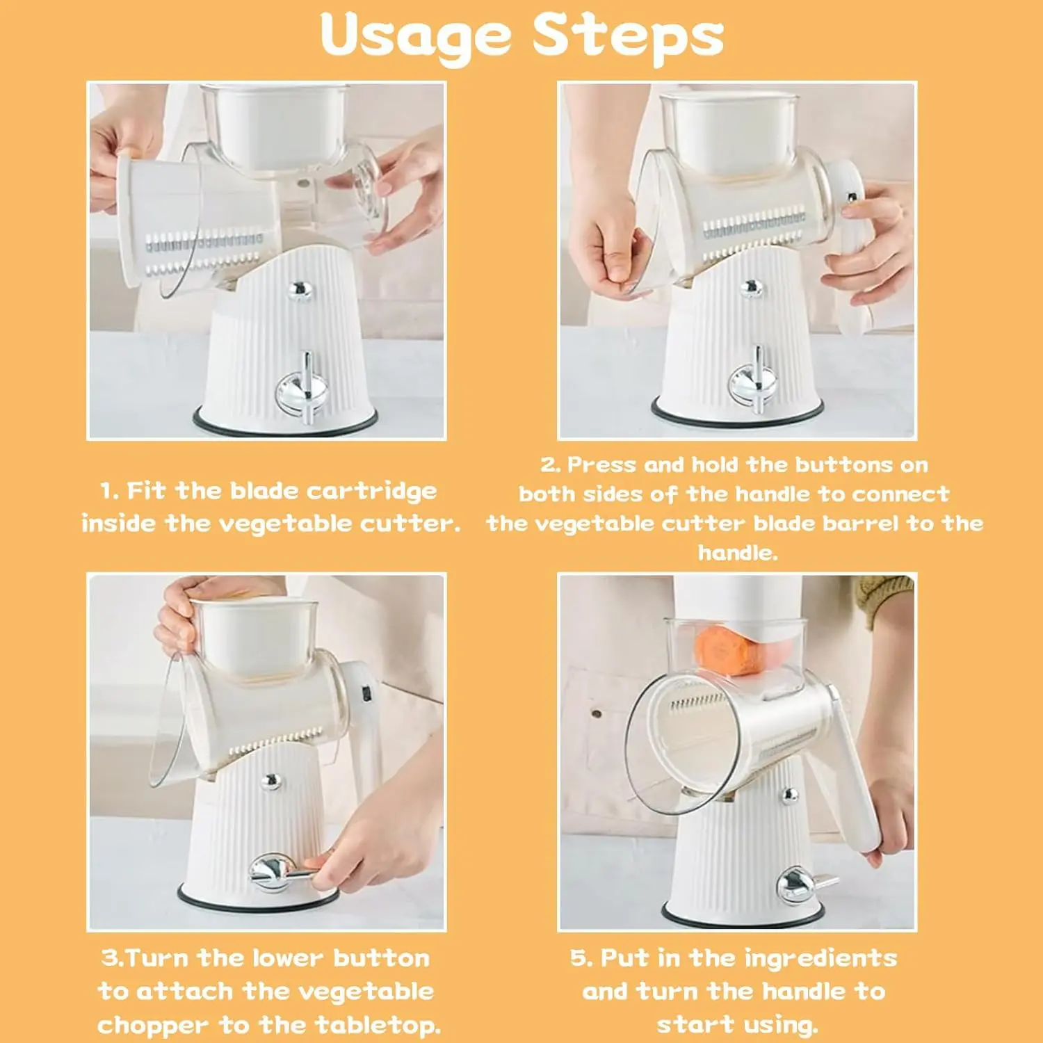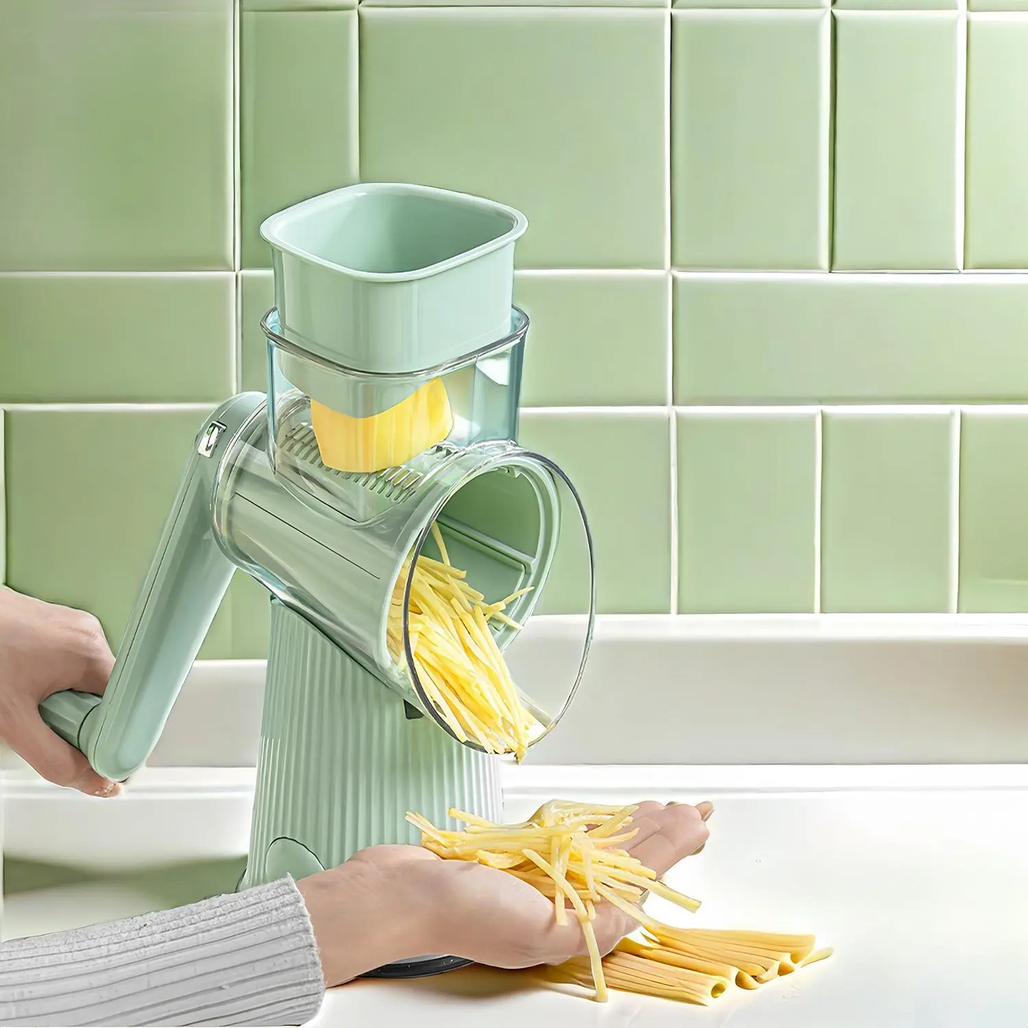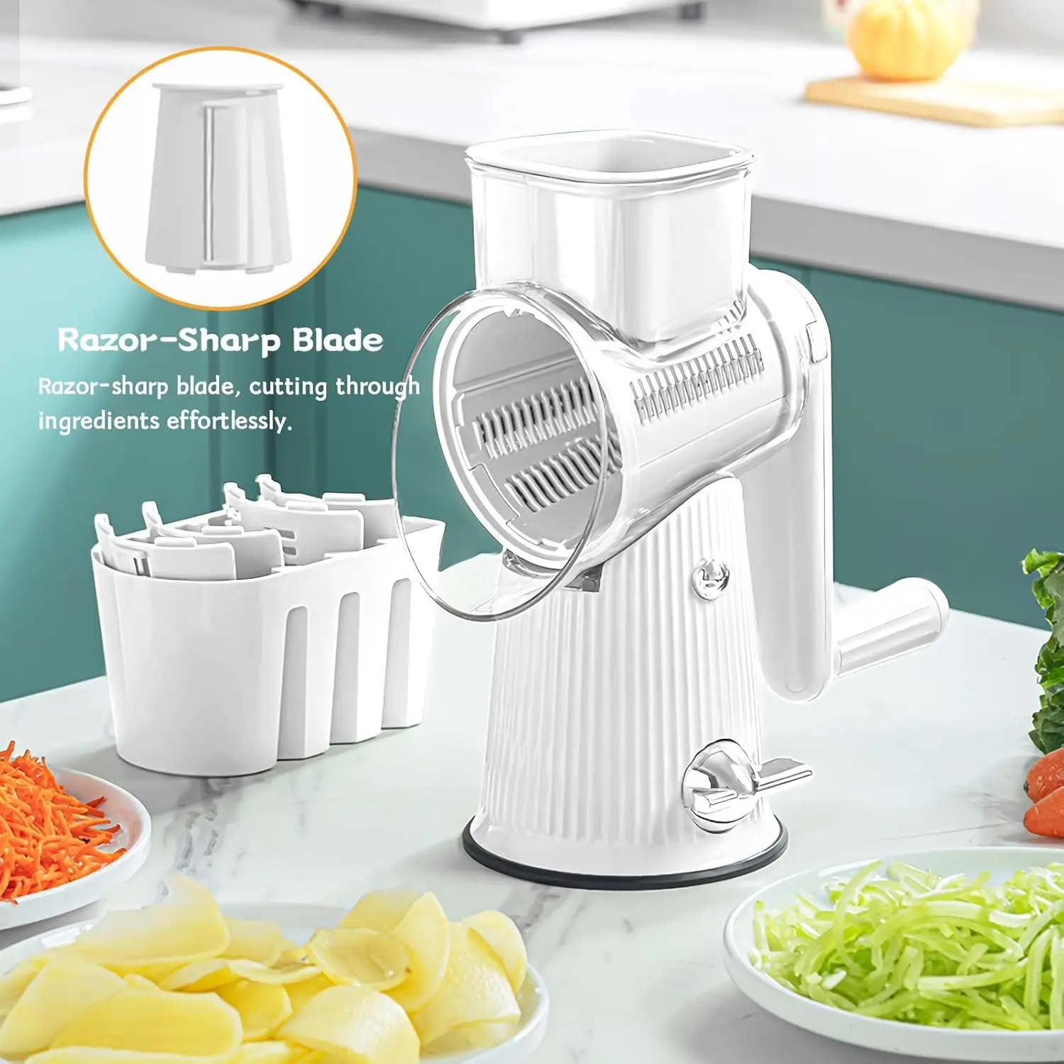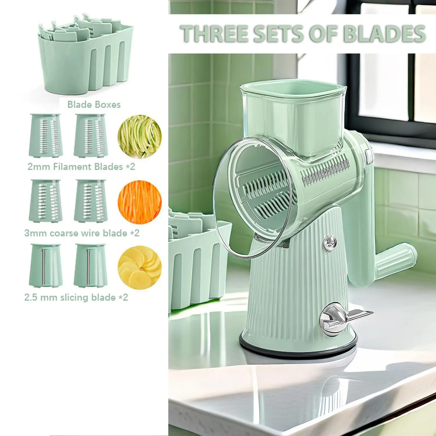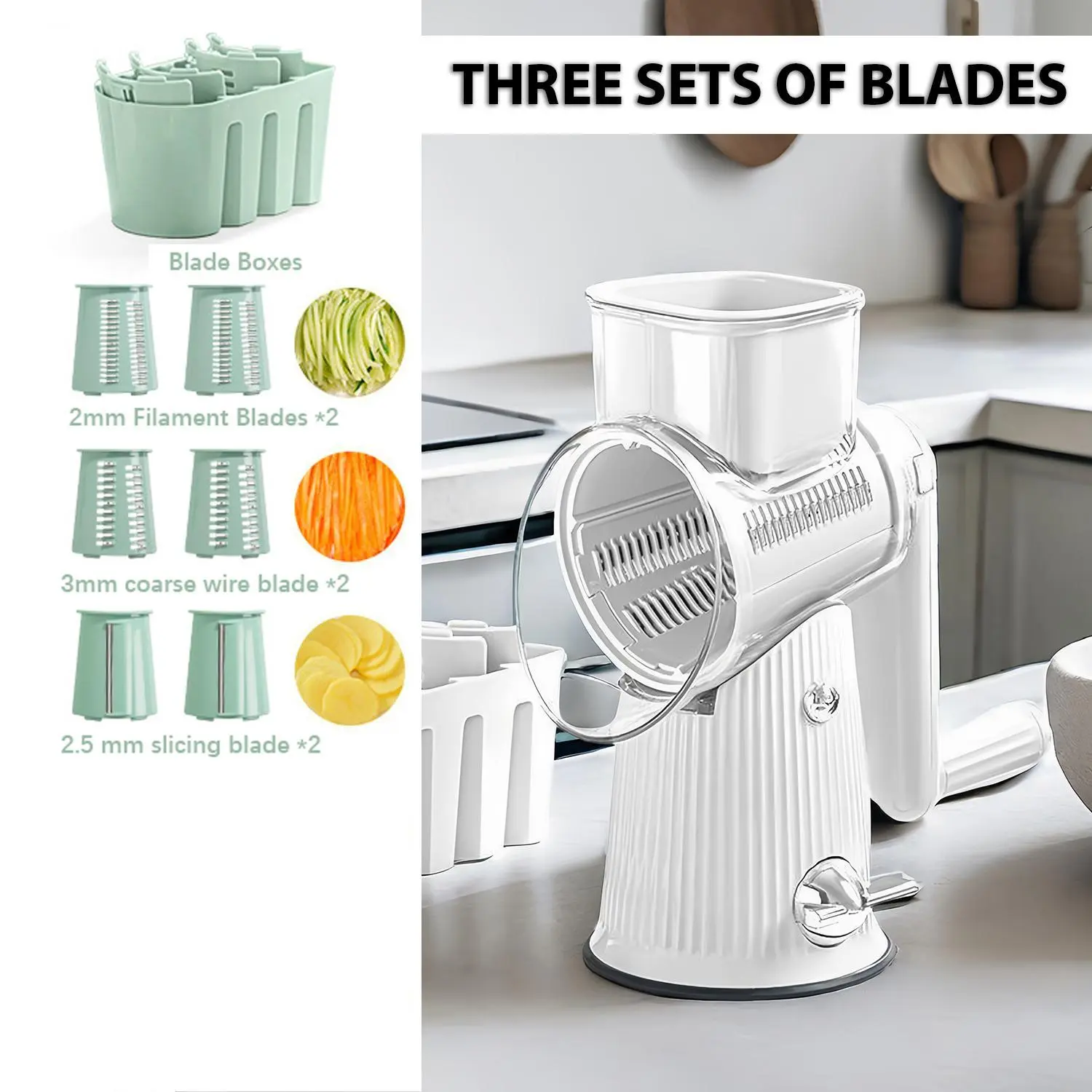 ·Versatile Blade Set: This multi-functional kitchen tool comes equipped with three distinct stainless steel blades: a 2mm x 2mm shredding blade, a 3mm x 2mm coarse shredding blade, and a 2.5mm x 2mm slicing blade. This diverse blade set effortlessly handles all food preparation tasks—from chopping and grinding to shredding—meeting every culinary need with ease.