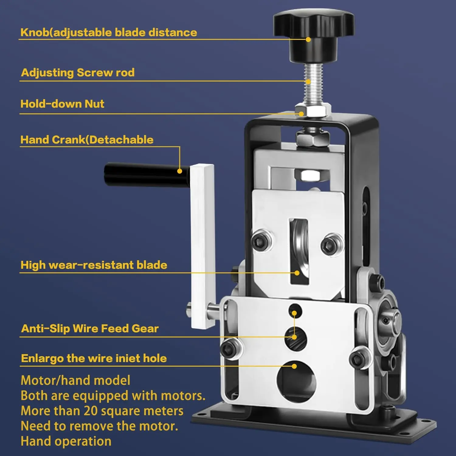 👍[Dual-design Operation Ways]This copper wire stripper offers the flexibility of both motor-driven and hand-cranked operation.With the hand crank, you can conveniently operate the machine manually.If your arms get tired from tedious hand operation, simply connect it to an electric drill via the connector for drill-driven operation.