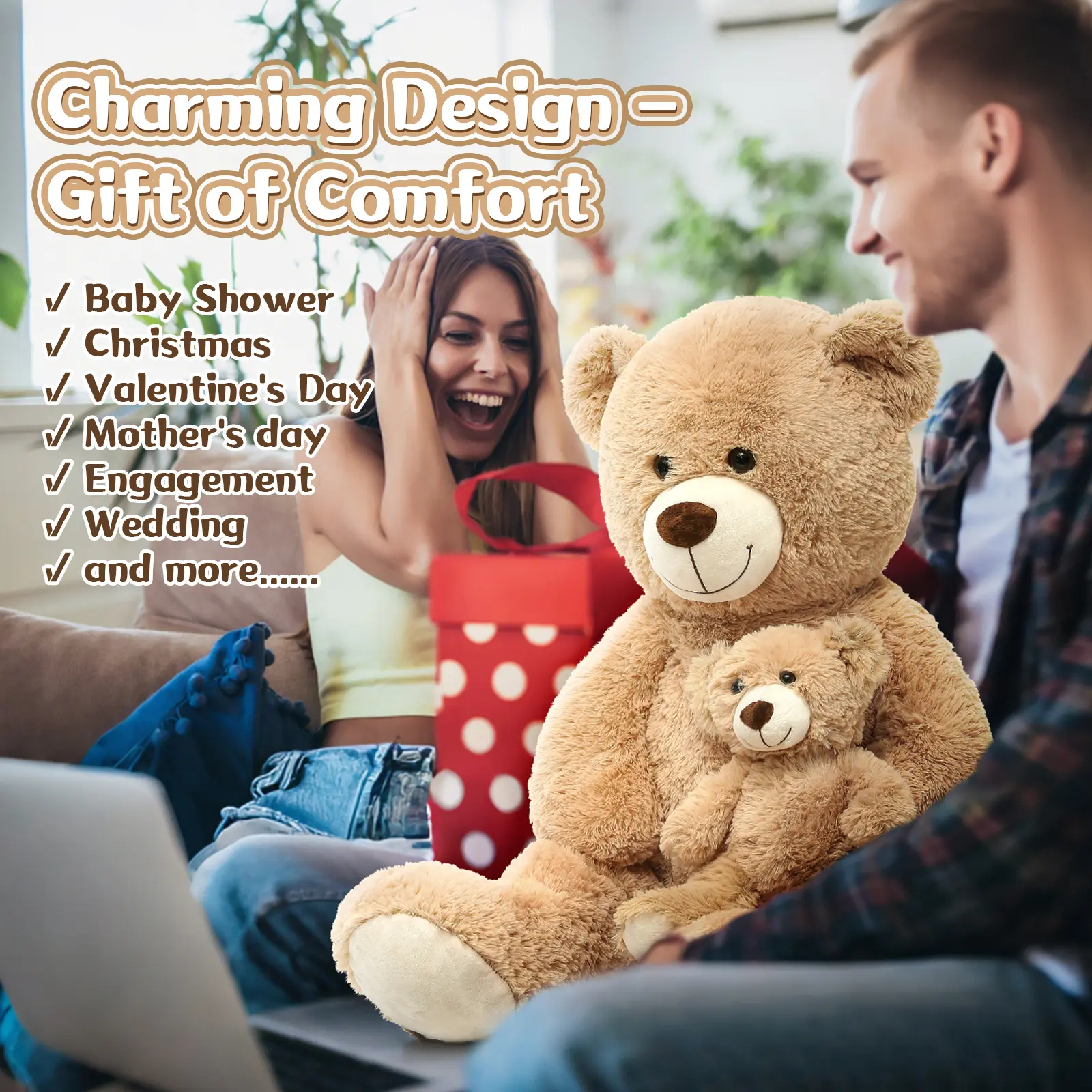 Perfect Gift Occasion: This big teddy bear is a heartfelt surprise for birthdays, anniversaries, Valentine's Day, baby showers, or just because. It’s a sweet way to say “I love you” without saying a word. Whether you're celebrating a special occasion or simply looking to add some comfort and cheer to your home.