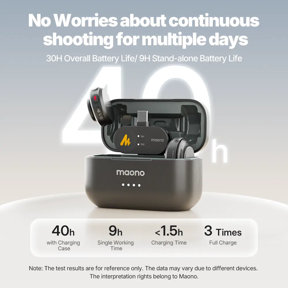 ⅤExtended 30H Battery Life & 1000ft Reliable & Stable Transmission- Enjoy up to 9 hours of battery life per transmitter, 30 hours with compact charging case. Wave T5 also allows phone charging while recording, ensuring continuous use during long trips, interviews, live streaming, and other intensive usage scenarios. With frequency-hopping technology, the Maono T5 lavalier microphone provides stable and clear audio transmission up to 300m (1000ft).