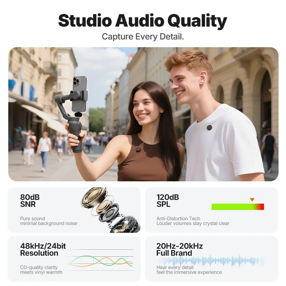 Ⅰ Studio-Grade Audio Quality: WAVE T5 wireless lavalier microphone delivers the industry's best 80dB signal-to-noise ratio, 120dB maximum sound pressure level, and 48kHz/24-bit audio format, capturing subtle sound details in various environments with a low noise floor.