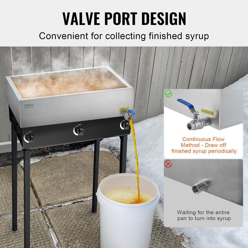 • High Processing Capacity: This maple evaporator processes up to 11.2 gallons of sap per batch, producing approximately 162 cups of 8.8 oz maple syrup. It features an adjustable valve for convenient flow control, allowing easy transfer of syrup into other containers.