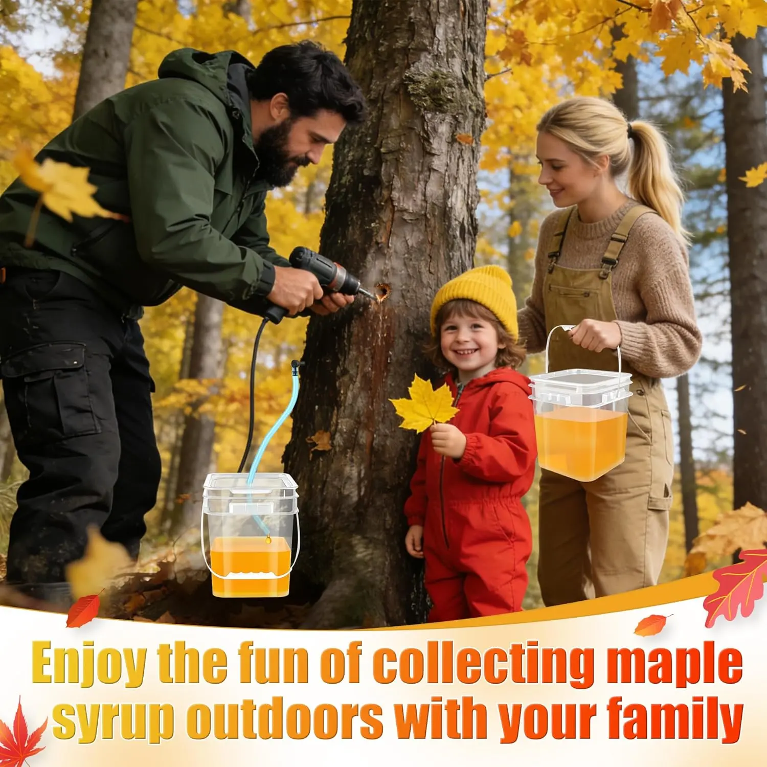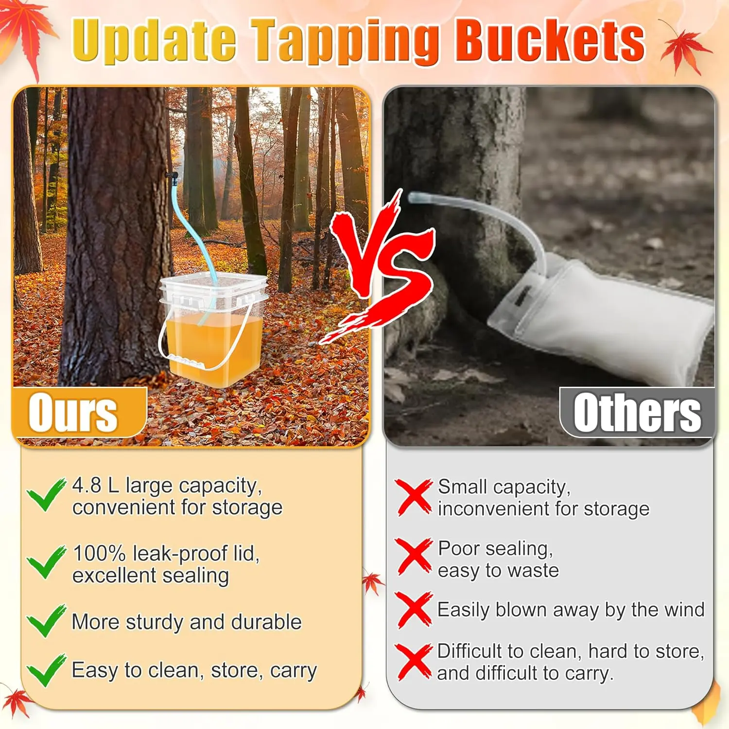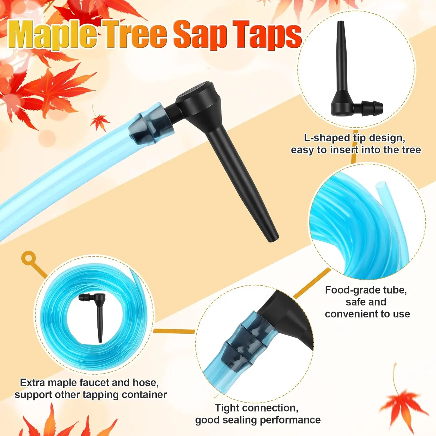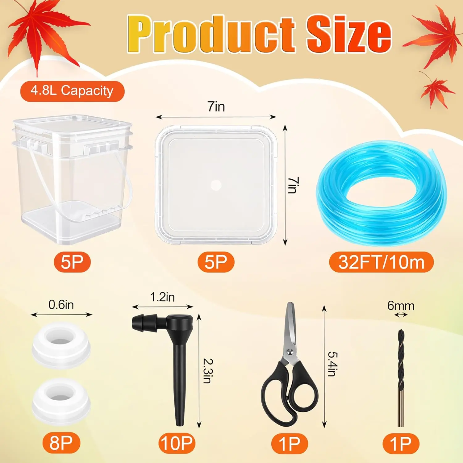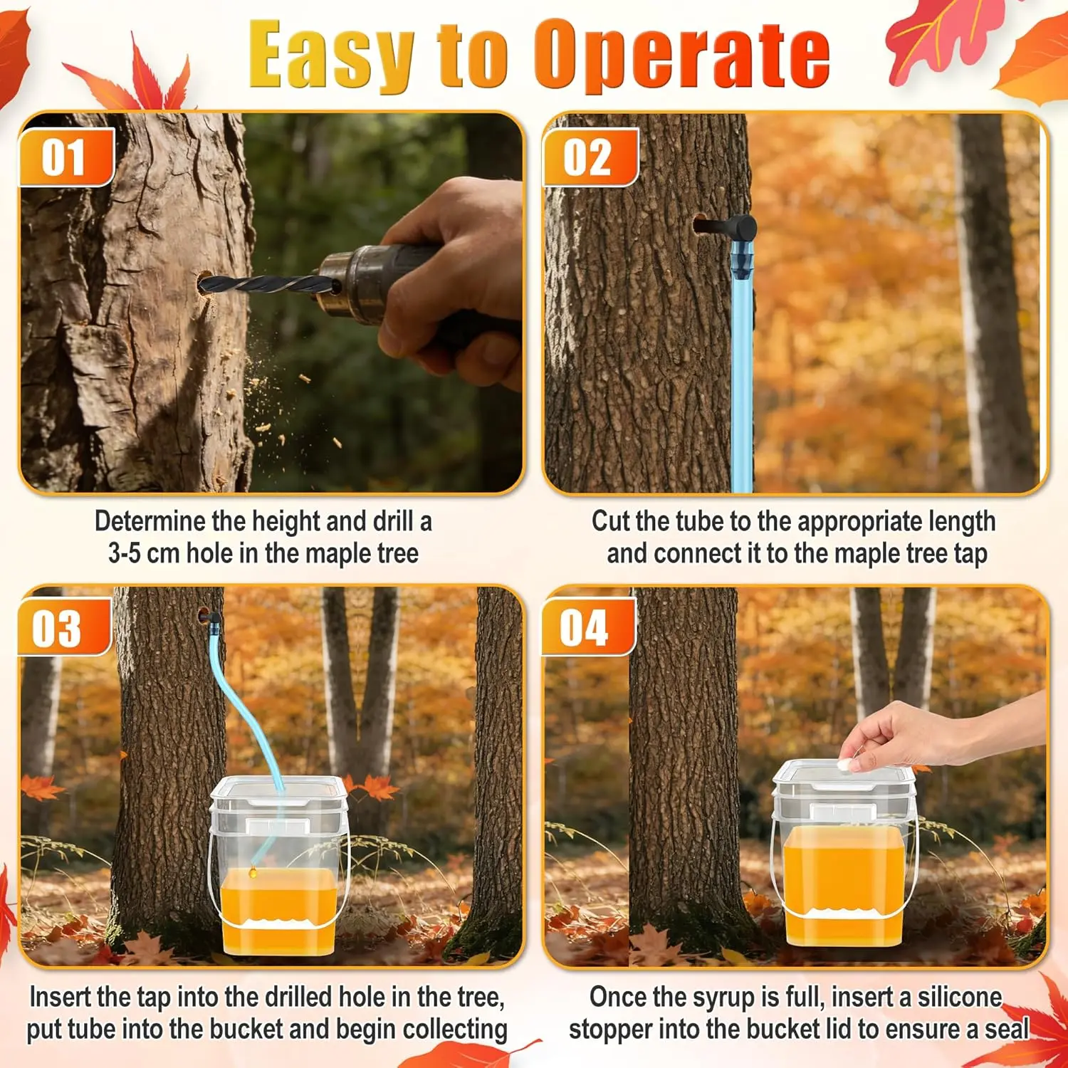 [Complete Collection Kit]: Package include 5P buckets with per-hole lids, 32FT tube, 10P maple syrup taps, 8P rubber plugs, scissors, 6mm drill, kits are included all necessary tools, convenient and suitable for starters and skilled.[Food-grade Safe Material]: Maple syrup tapping kits are made of all food-grade plastic and rubber, 100% safe for contact with maple syrup.The thicker material for long-time use will not deform or break, is washable, reusable, and durable.[Update Tapping Buckets]: 4.8L Large tapping buckets are more convenient to tapping, carrying and storage than traditional tapping bags, with larger collection volume, and updated 100% anti-leakage lids ensure the maple syrup will not be wasted during tapping.[Extra Tapping Accessories]: Although we only contain 5P collection buckets, we have provided additional 3P maple syrup taps and enough tubes, supporting the use of other containers for tapping, to meet larger collection needs.[Easy to Operate]: Package includes a details user manual, simply follow the instructions to easily collect even for beginners. However, please note: to avoid overflow, please check the collection status after 8-12 hours.