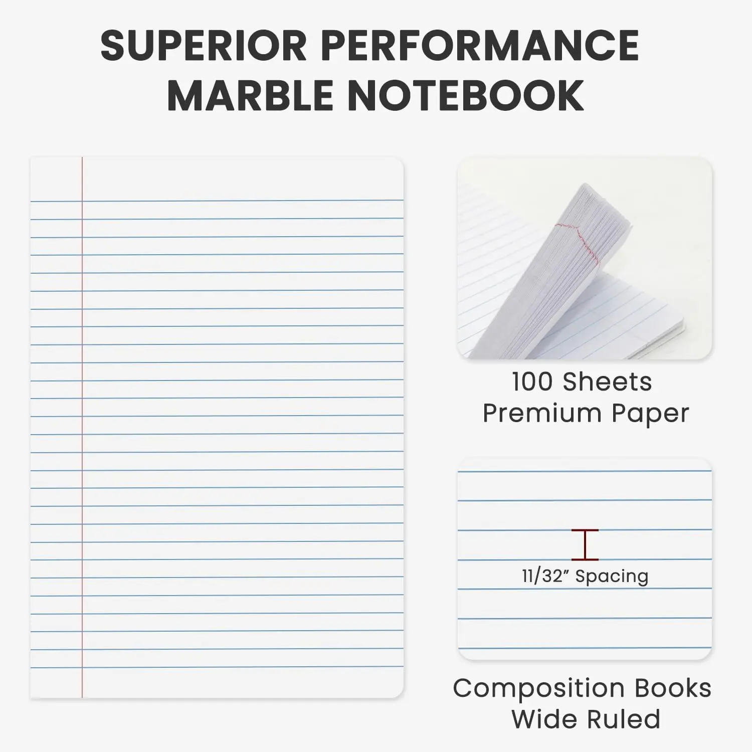 Wide Ruled Layout for Comfortable Writing:Our composition books wide ruled provide extra spacing for neat and legible writing. These composition notebooks wide ruled are for or anyone needing clarity. Each wide rule composition notebook is filled with quality pages. The wide ruled composition notebook is especially useful for handwriting practice. Teachers rely on wide ruled composition notebooks for their classrooms every year.