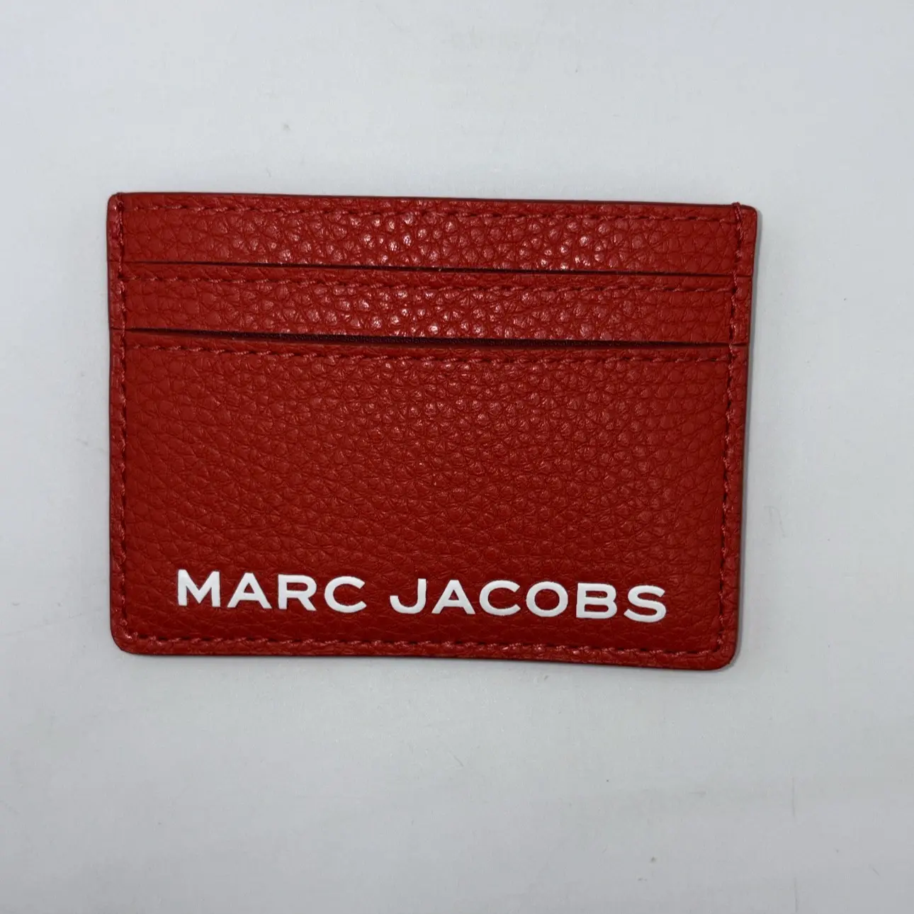 -A compact leather card holder in a vibrant red finish with bold MARC JACOBS logo detail.