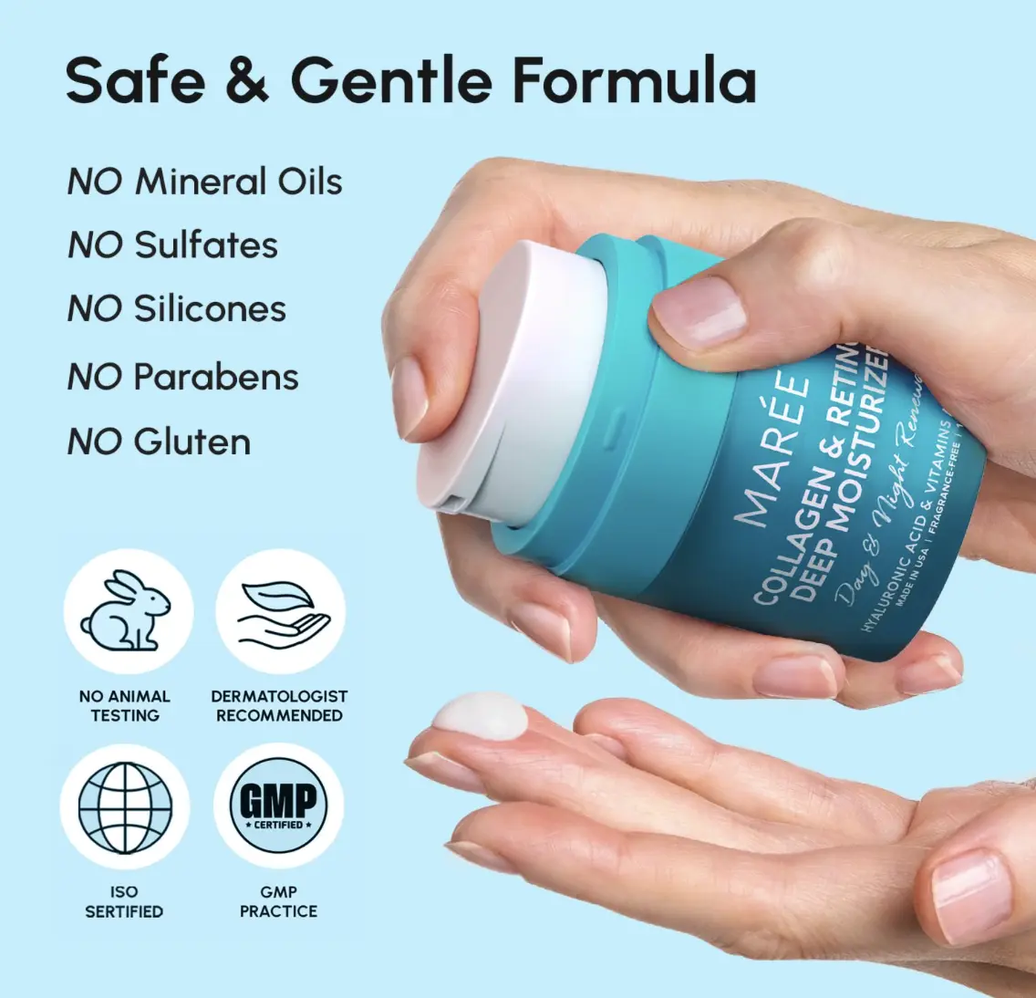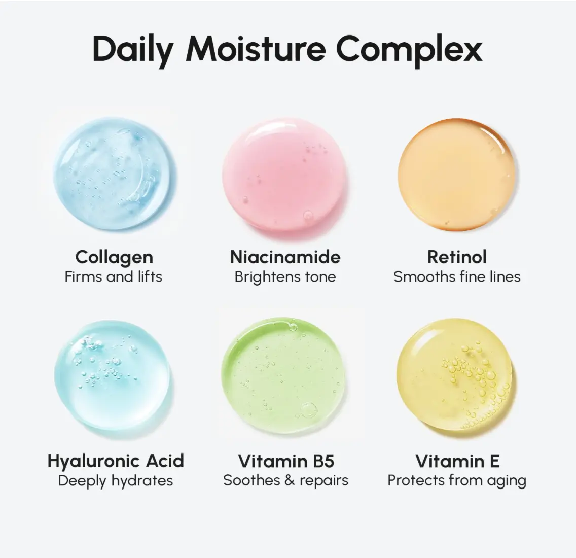 Moist lasts hours. Face fresh makeup free days. Collagen feels real slow firm.