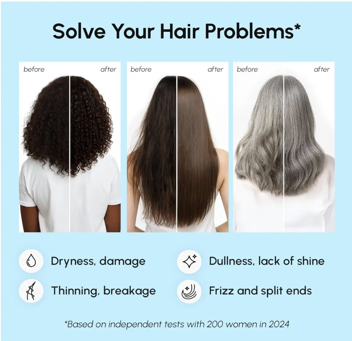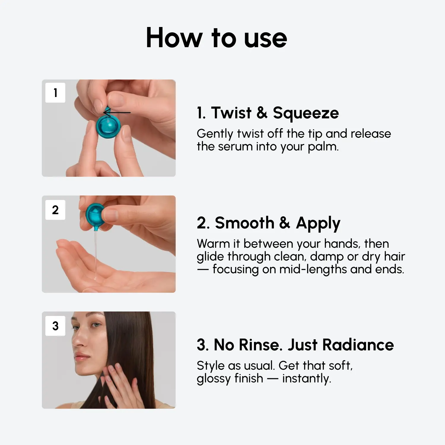 Use everywhere, anytime — Our hair serum is suitable for all hair types: straight, wavy, curly, natural, or color-treated. Use these leave-in serum capsules to treat and condition your hair without making it heavy or greasy. Just open a capsule and massage the contents into your towel-dried hair.