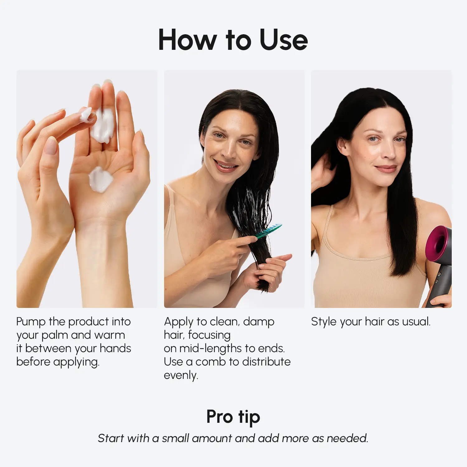 ·Apply to damp hair after washing.