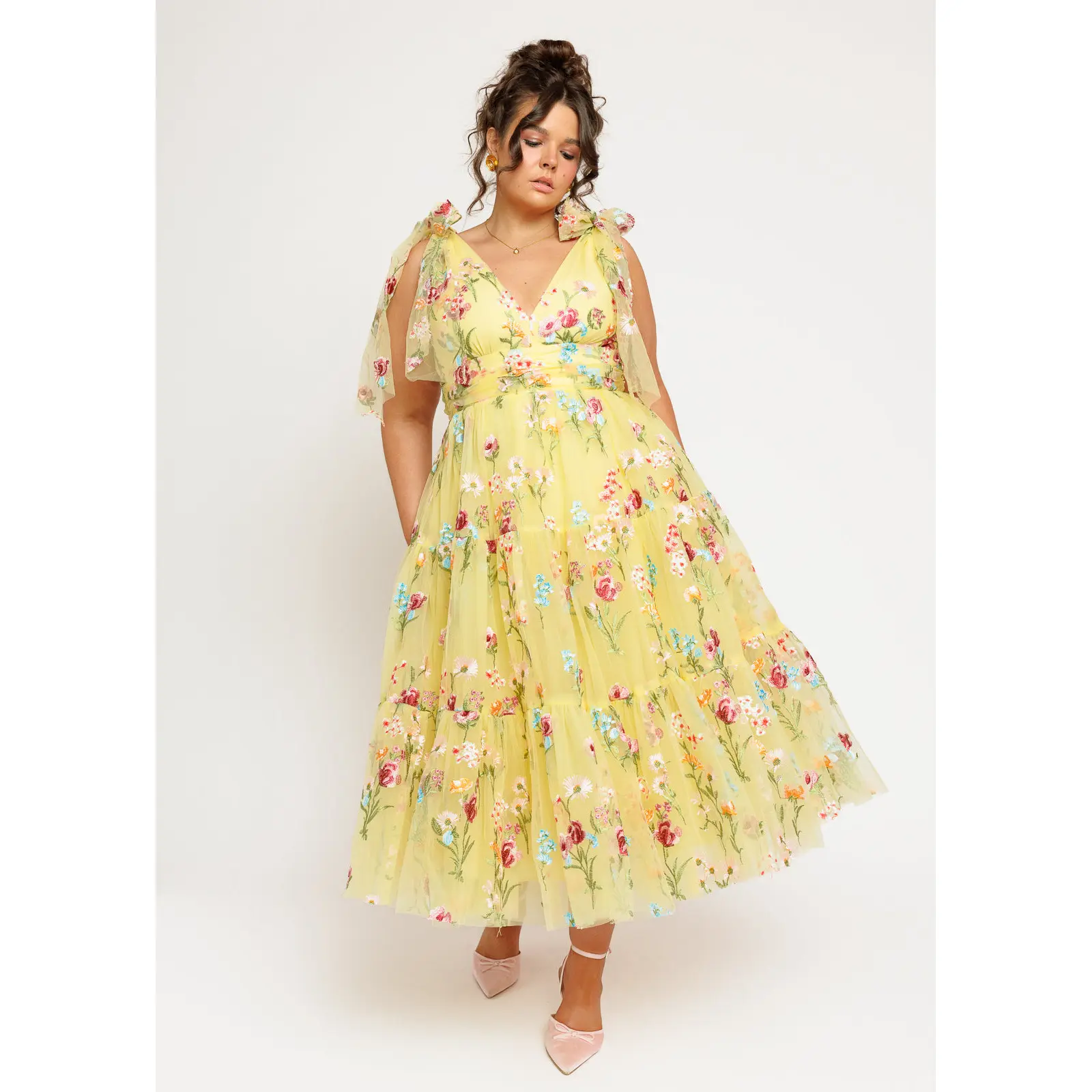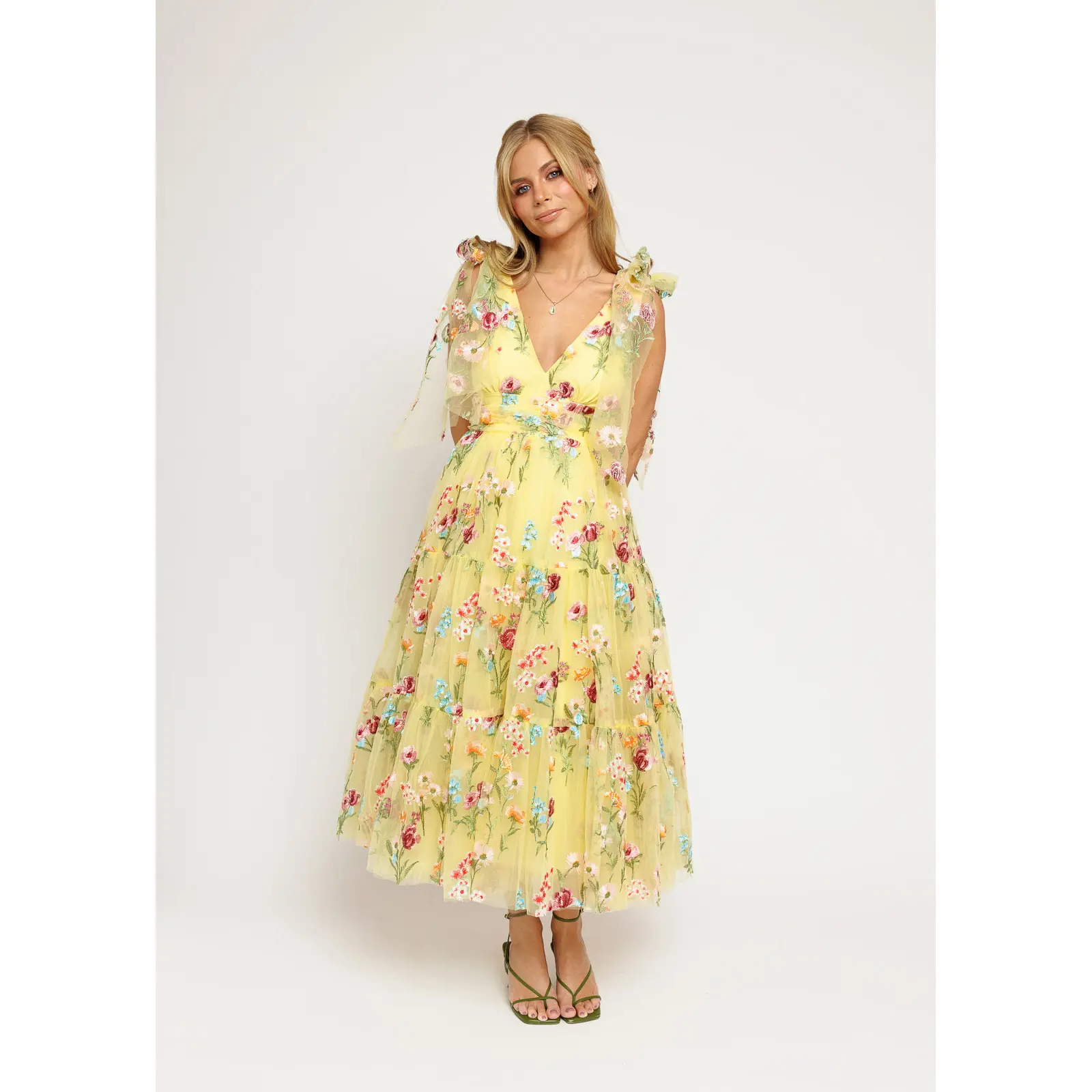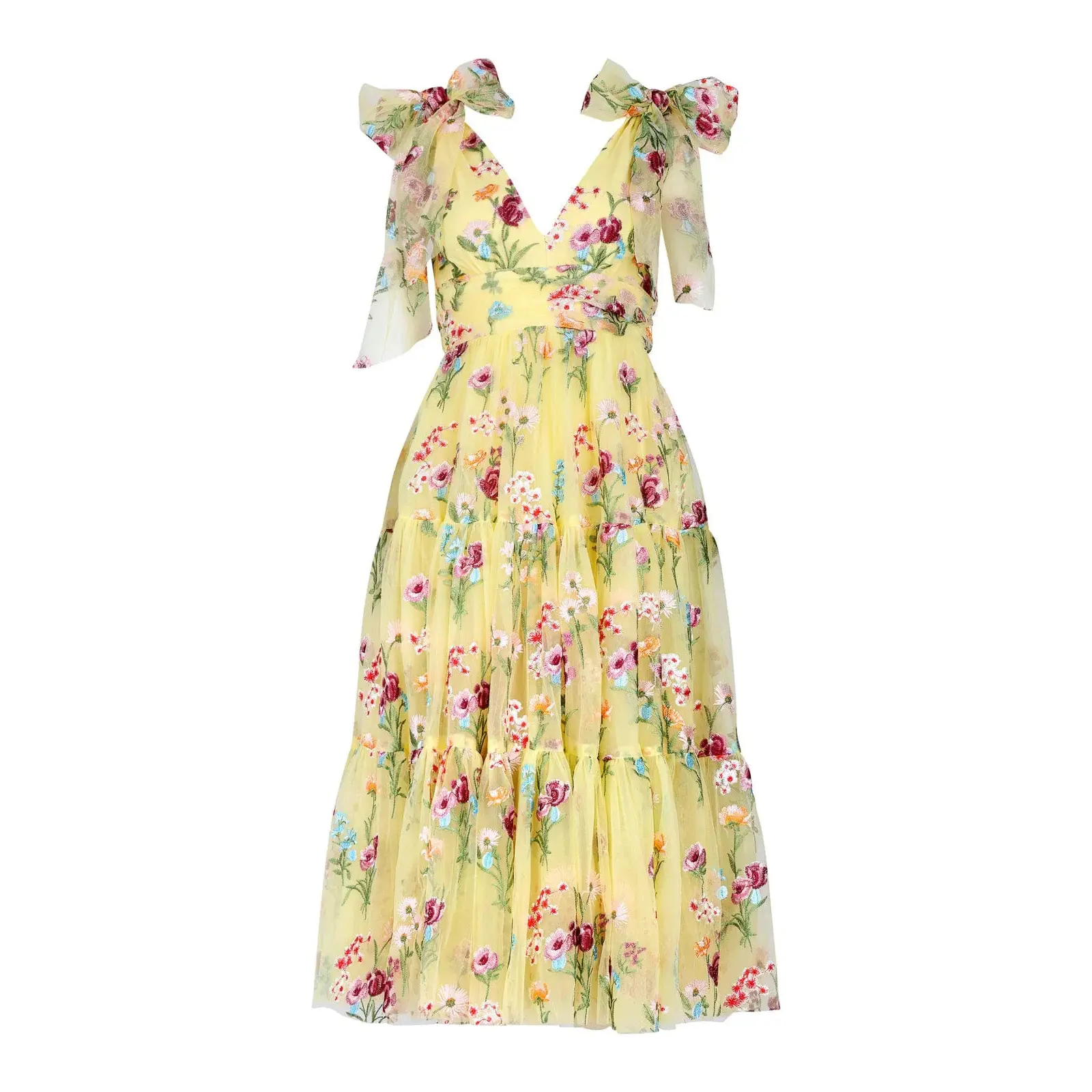 A yellow floral-embroidered midi with a V-neck, ruched waist, tiered skirt, and signature shoulder bows for an elegant, romantic look.