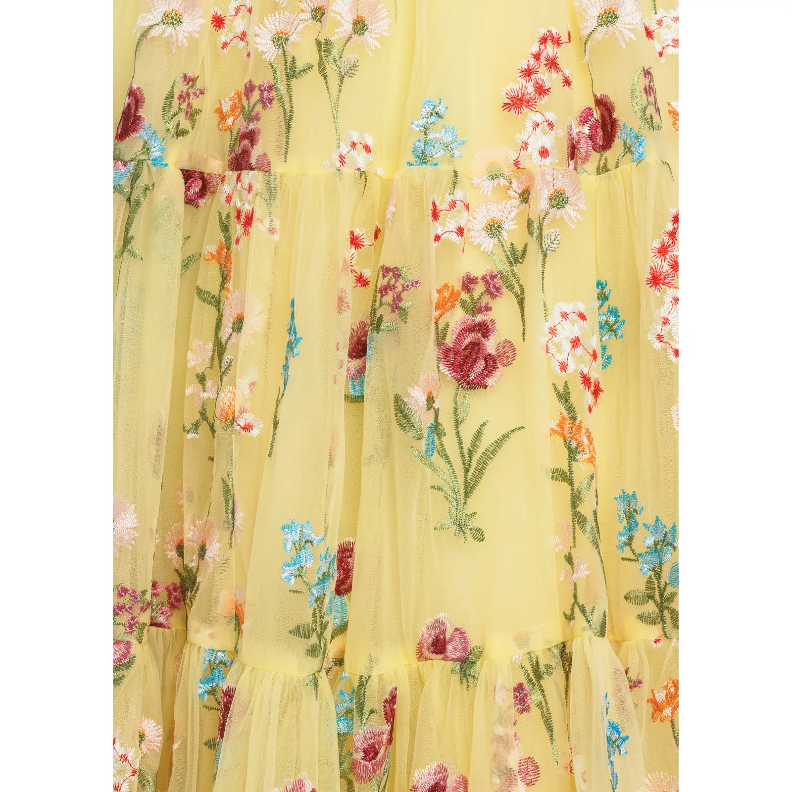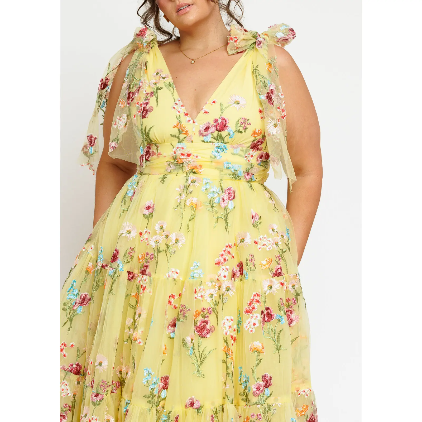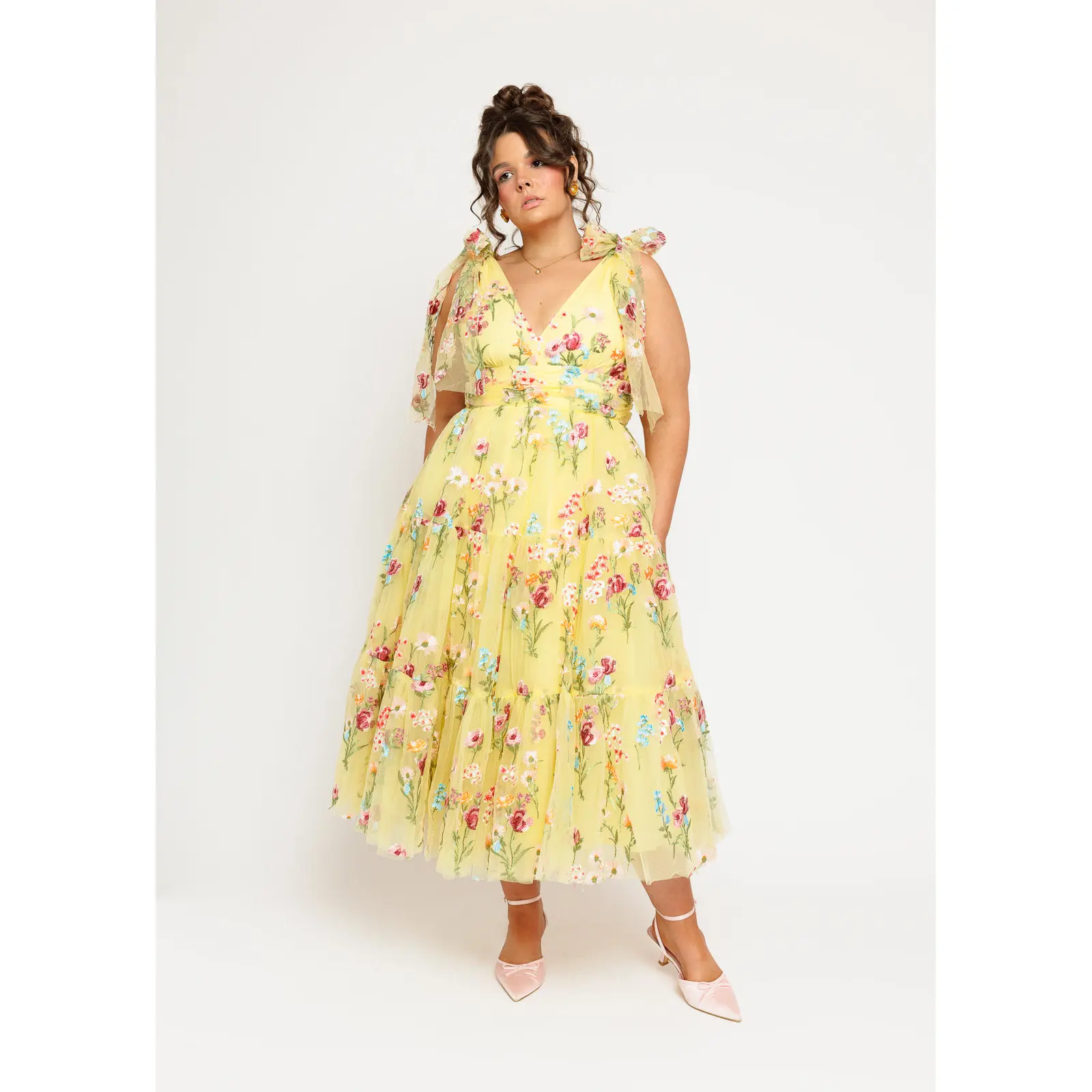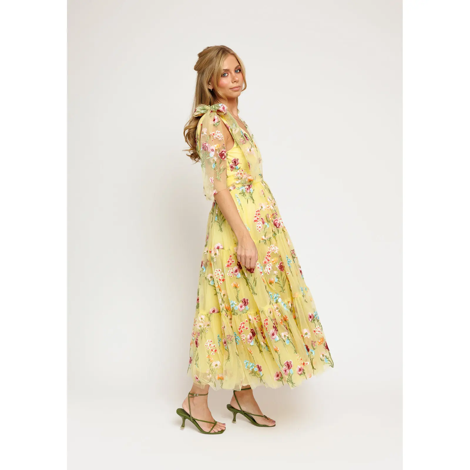 A yellow floral-embroidered midi with a V-neck, ruched waist, tiered skirt, and signature shoulder bows for an elegant, romantic look.