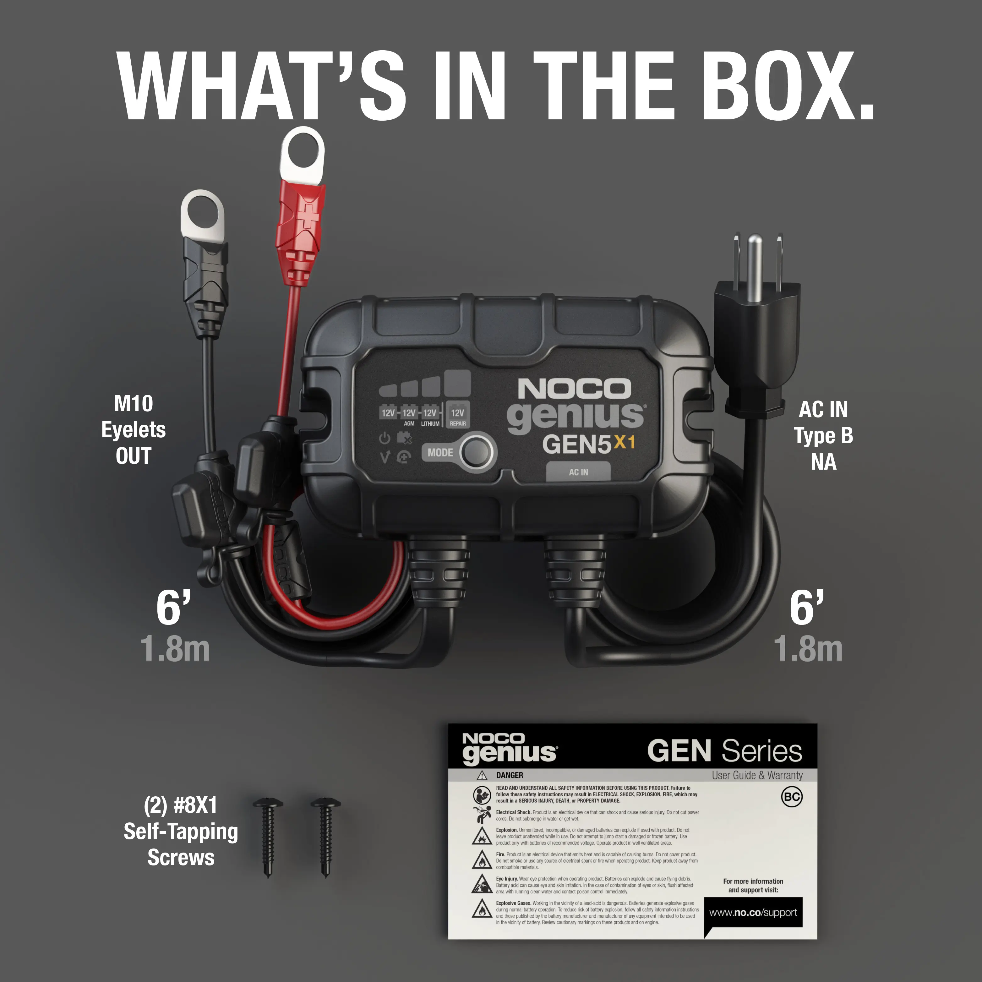 What's in the box - GEN5X1 5-amp 1-bank waterproof onboard marine battery chargers (120-240VAC) with a 72-Inch DC cables with 3/8-inch eyelets and a 72-inch Type-B AC cable, (2) self-tapping mounting screws, user guide, and 3-year warranty.