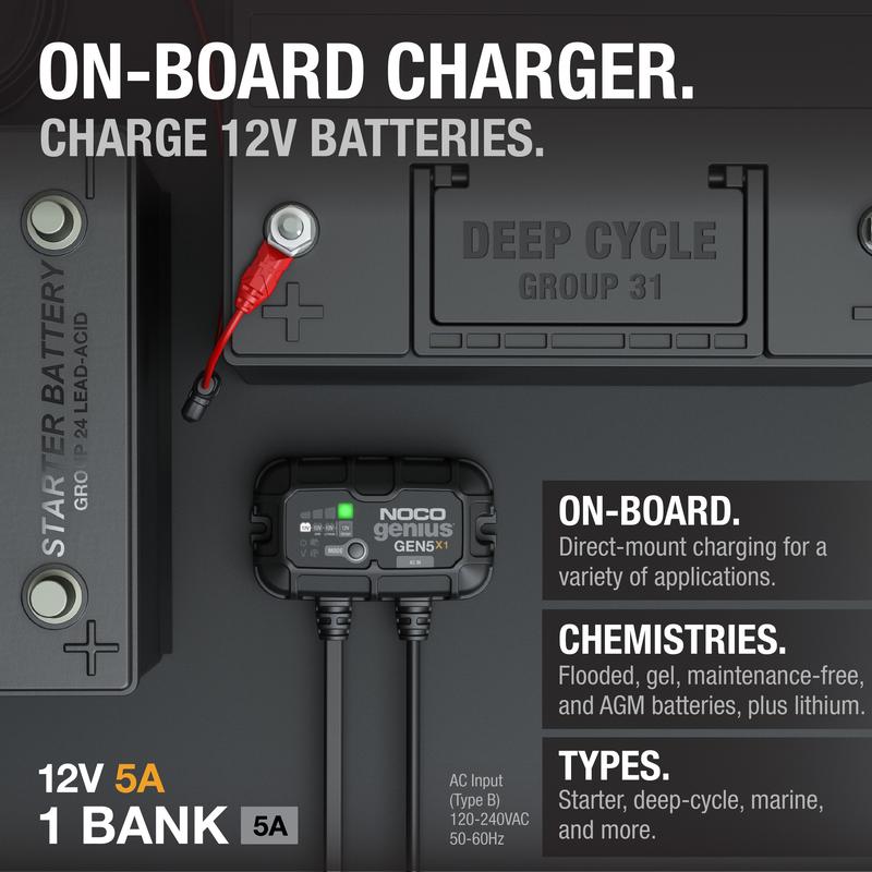Multiple banks - A one-bank onboard battery charger rated a 5-amps - 5-amps per bank - for 12-volt batteries, including marine, boat, starter, and deep-cycle batteries.