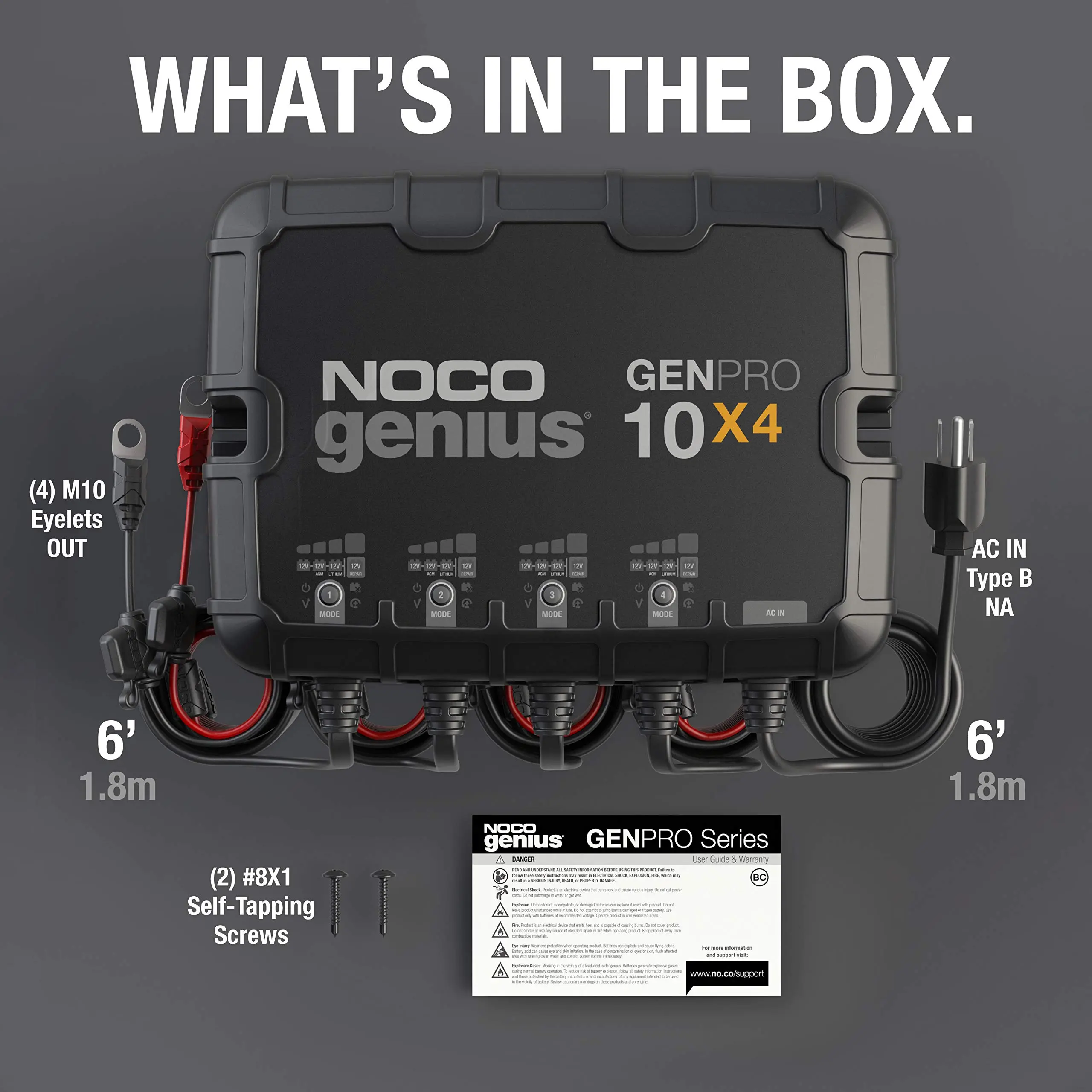 What's in the box - GENPRO10X4 40-amp 4-bank waterproof onboard marine battery chargers (120-240VAC) with a 72-Inch DC cables with 3/8-inch eyelets and a 72-inch Type-B AC cable, (2) self-tapping mounting screws, user guide, and 3-year warranty.