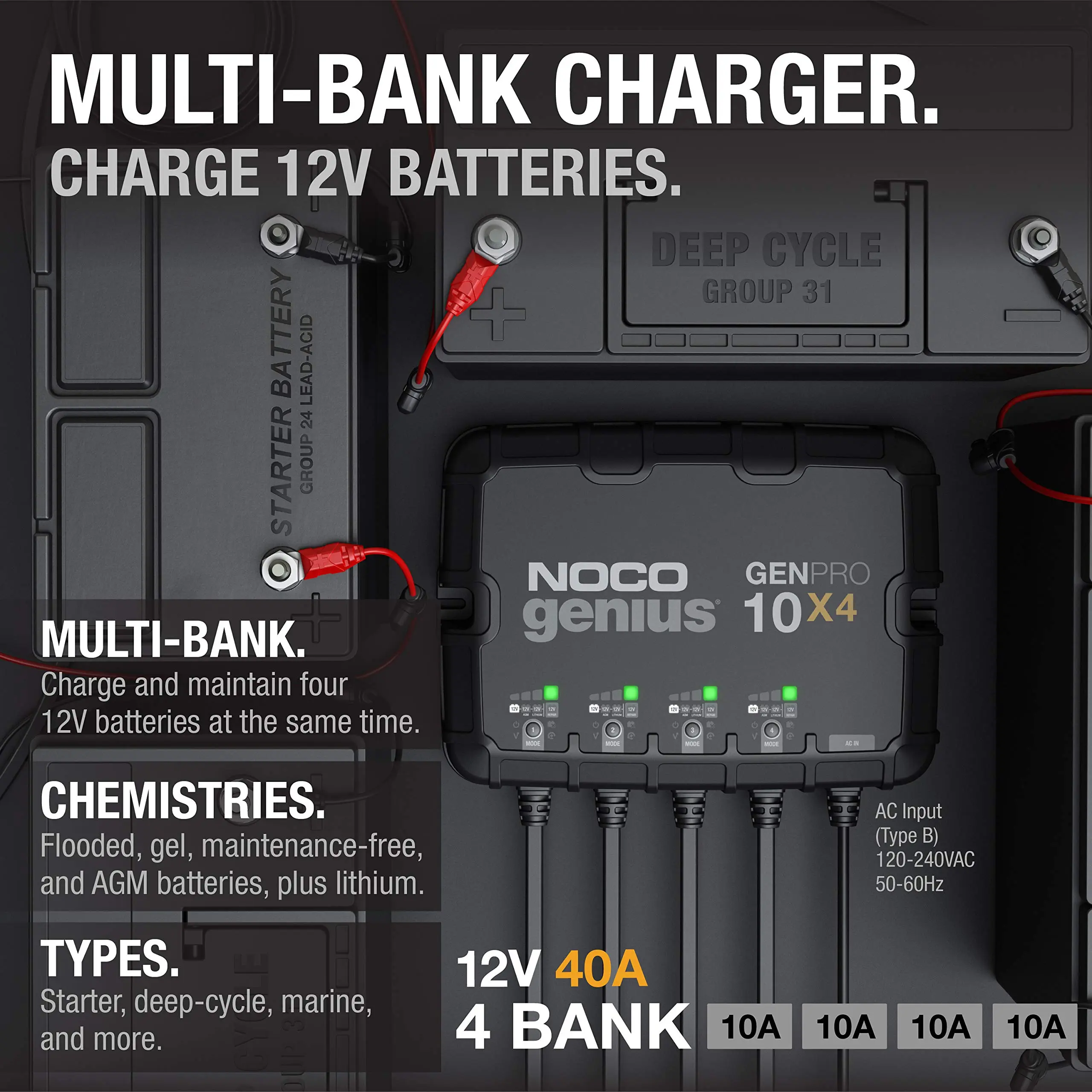 Multiple banks - A four-bank onboard battery charger rated a 40-amps - 10-amps per bank - for 12-volt batteries, including marine, boat, starter, and deep-cycle batteries.