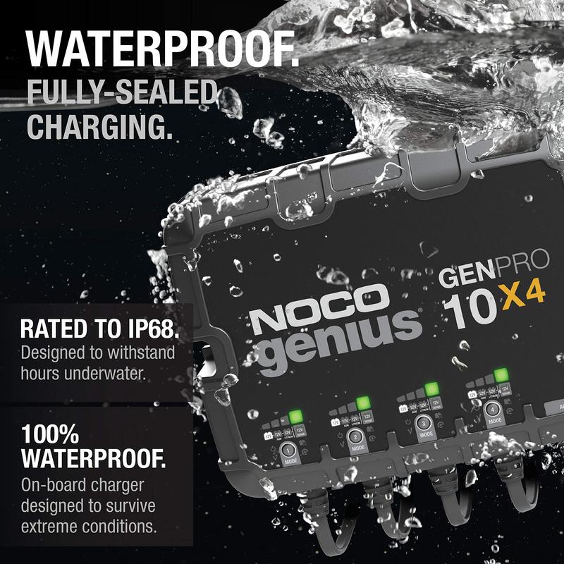 Designed for water - A fully-sealed and waterproof onboard battery charger with an ingress protection rating of IP68, but has survived brutal life cycle testing, including thousands of hours underwater.