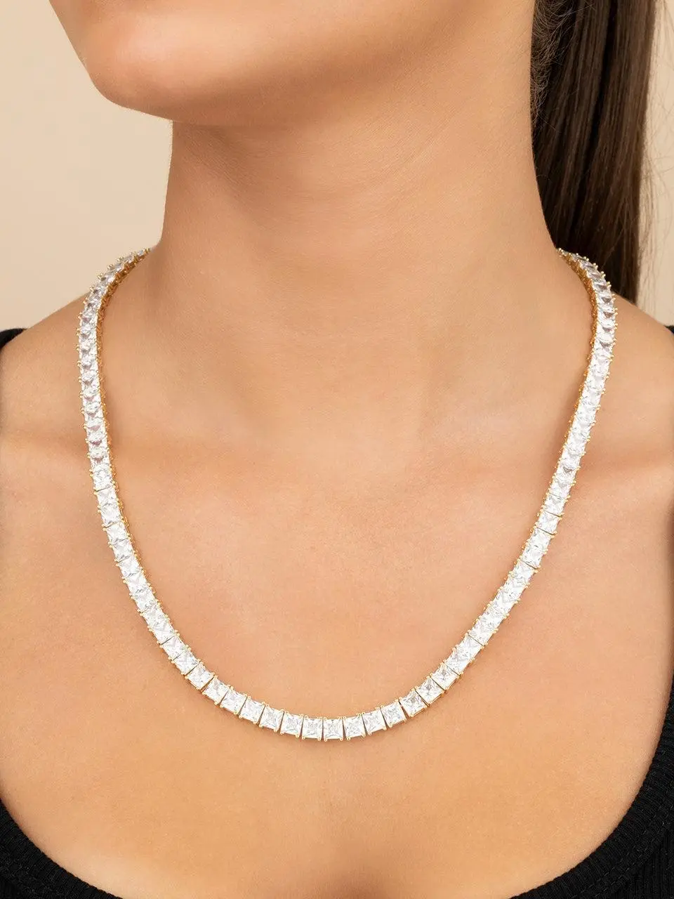The boldest link in your layering game. This squared tennis necklace delivers max shine with every angle—no spotlight needed.