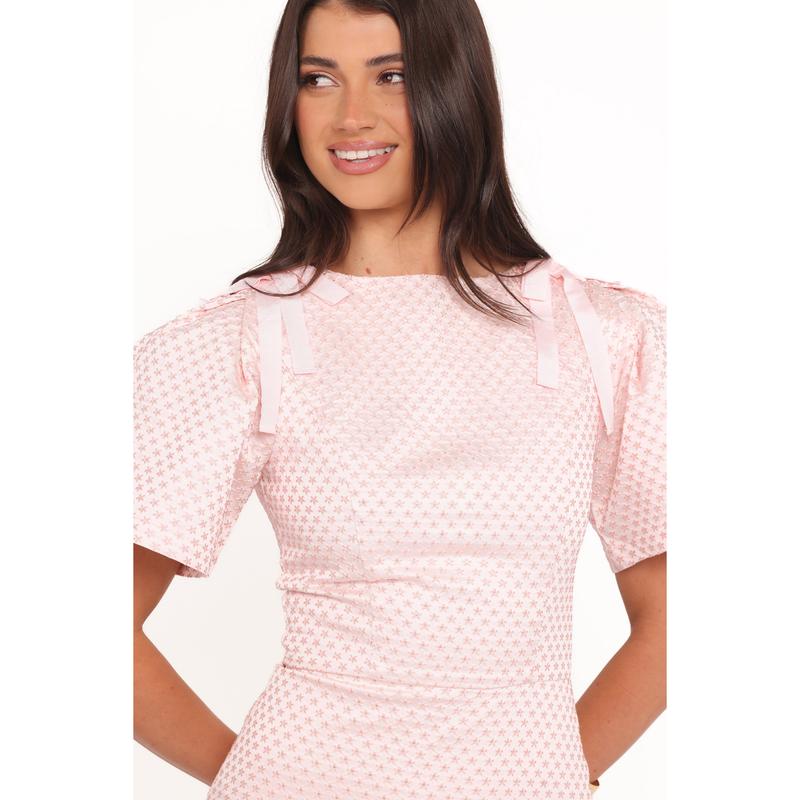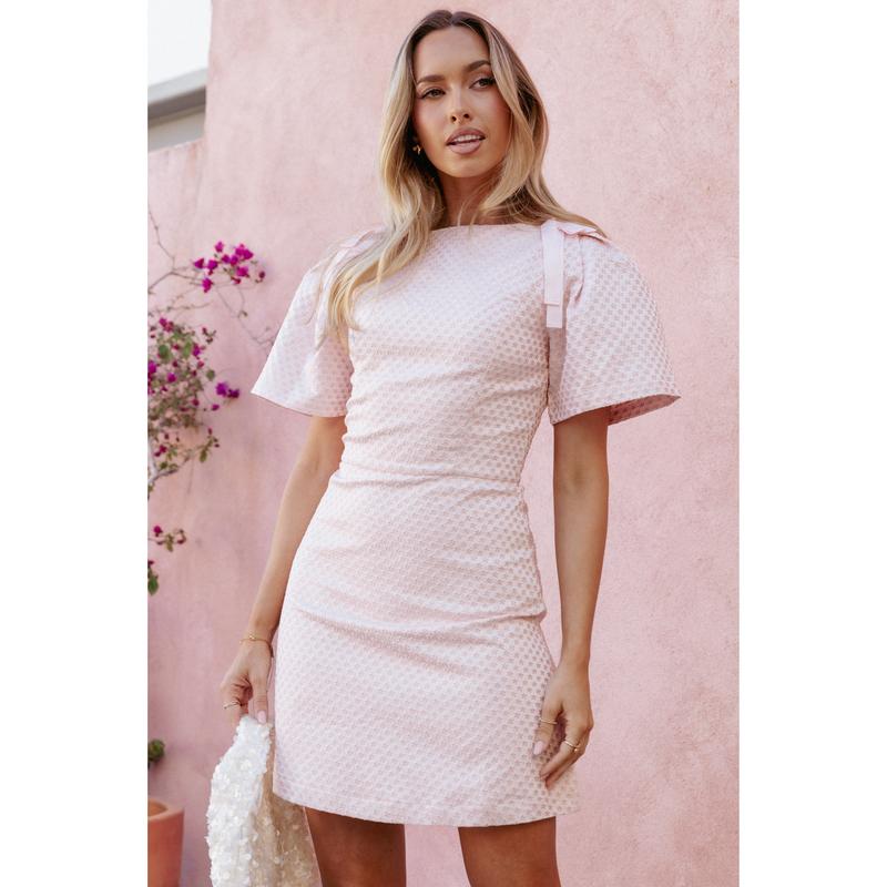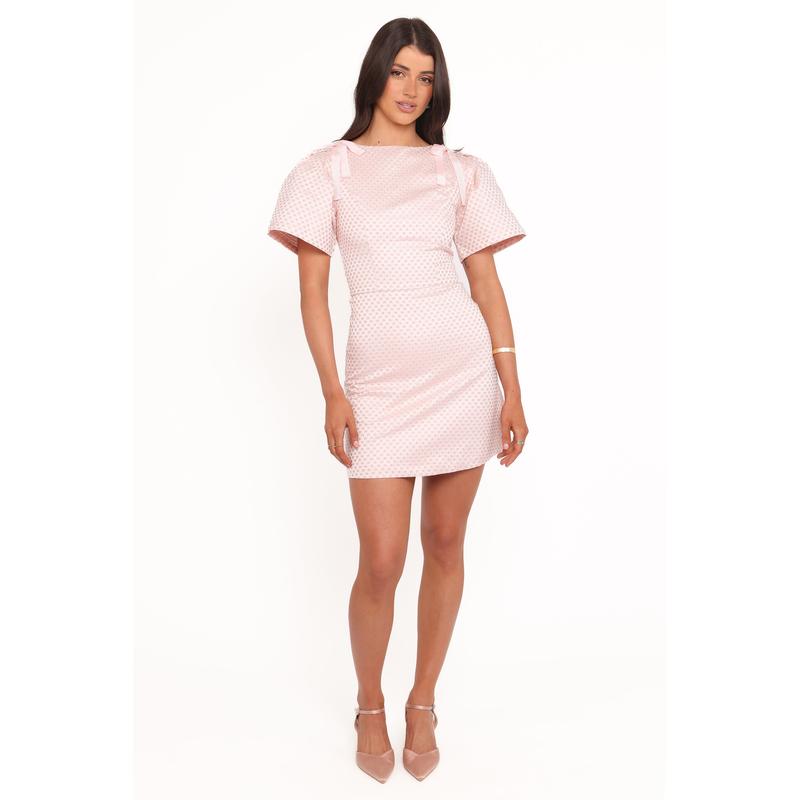 Turn heads and steal the spotlight in the Marlene Mini Dress in Pink Rose Brocade. This stunning piece features an enchanting floral brocade fabric interwoven with shimmering gold lurex thread that catches the light beautifully with every step you take.