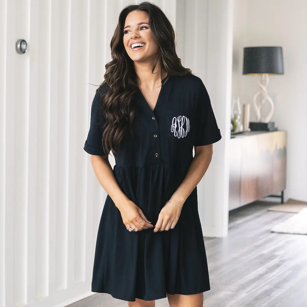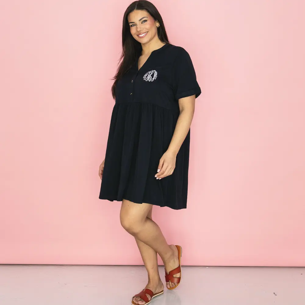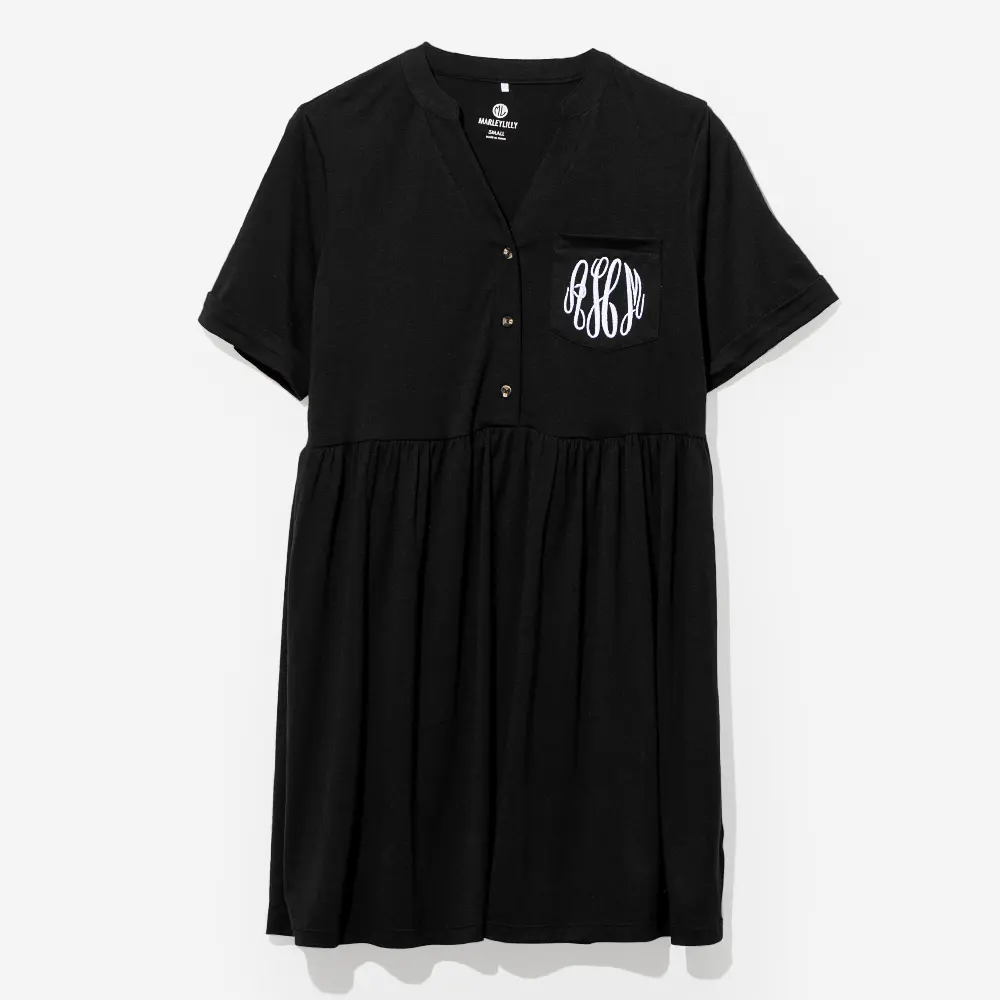 Say Hello to your new favorite everyday dress- the Monogrammed Split Neck Gathered Dress from Marleylilly! Effortlessly stylish and oh-so comfortable, this flattering piece features a classic split neck dress silhouette and a cinched gathered waist for a bit that's both relaxed and feminine. Perfect for brunch with friends, running errands, or causal days at the office, this dress is made to move with you through every part of your day. Add your monogram for that personal Marleylilly touch and a pop of preppy charm!