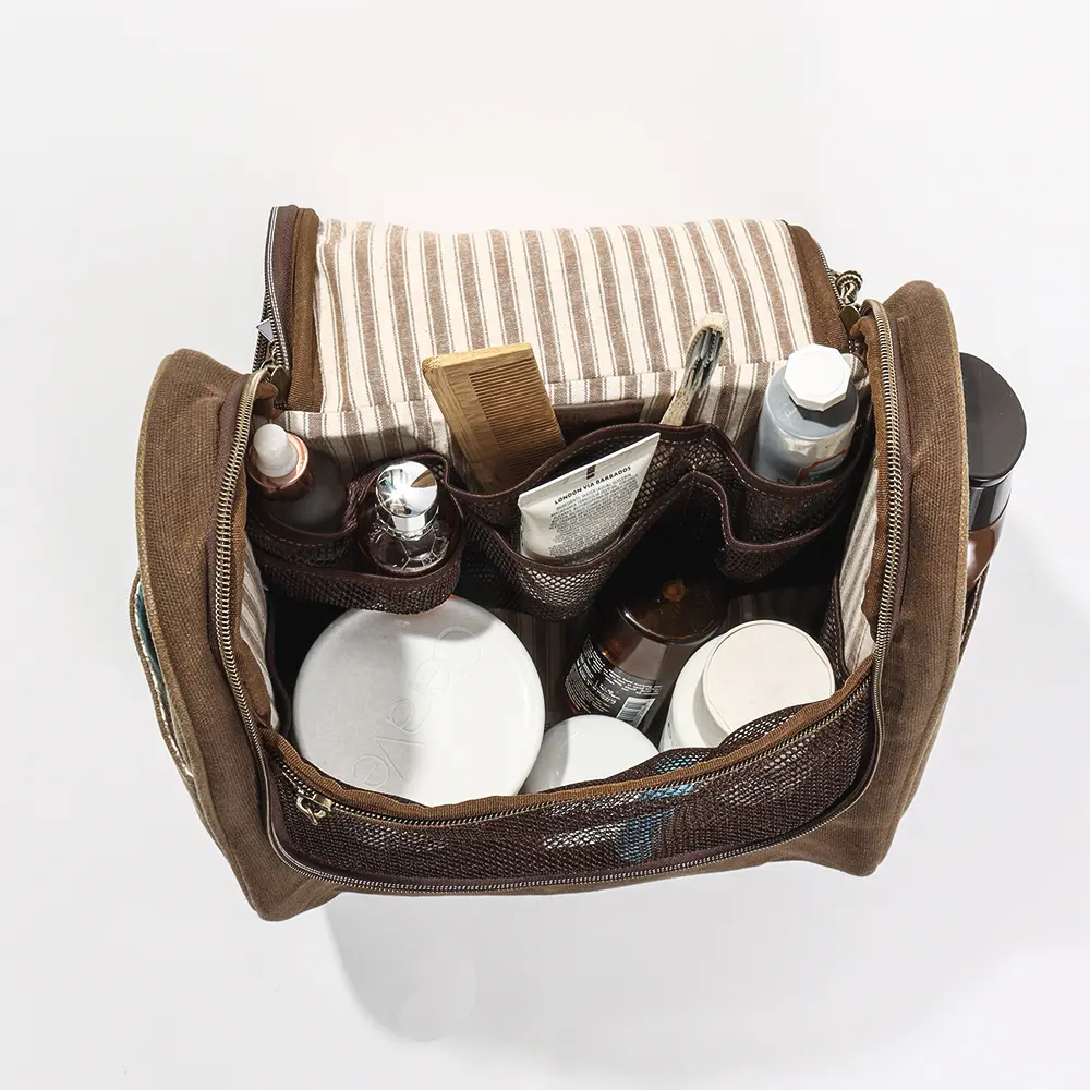 Marleylilly ML Personalized Waxed Canvas Hanging Toiletry Bag in Brown with Multiple Compartments & Custom Initials