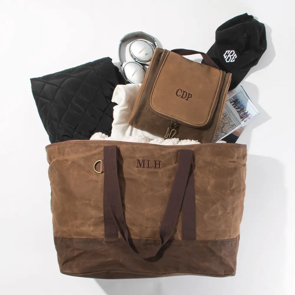 Elevate your travel experience with Marleylilly's Personalized Waxed Canvas Hanging Toiletry Bag in Brown. This ruggedly stylish bag is designed to keep your essentials organized, featuring multiple compartments and two convenient side pockets. Crafted from durable waxed canvas and customizable with your initials, it's the perfect blend of style and functionality for your journeys. This would also make for the perfect gift for any special man in your life!