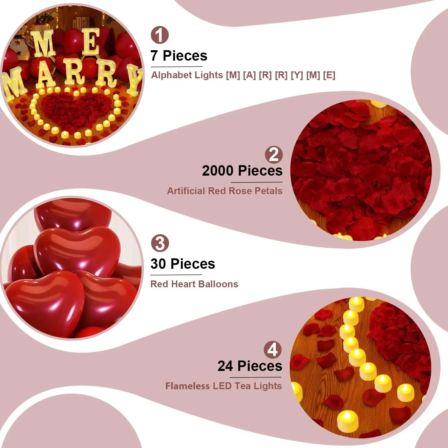 Impressive Romantic Kit 🌹- 7Pcs Letter Light Up Sign: Forms the phrase "MARRY ME"- 24Pcs Romantic Love Tea Lights- 2000Pcs Burgundy Fake Rose Petals- 30Pcs Burgundy Love Latex Balloons- Total Kit: 2061 pieces- Perfect for: Proposal ceremony, Valentine's Day, wedding proposal, romantic night