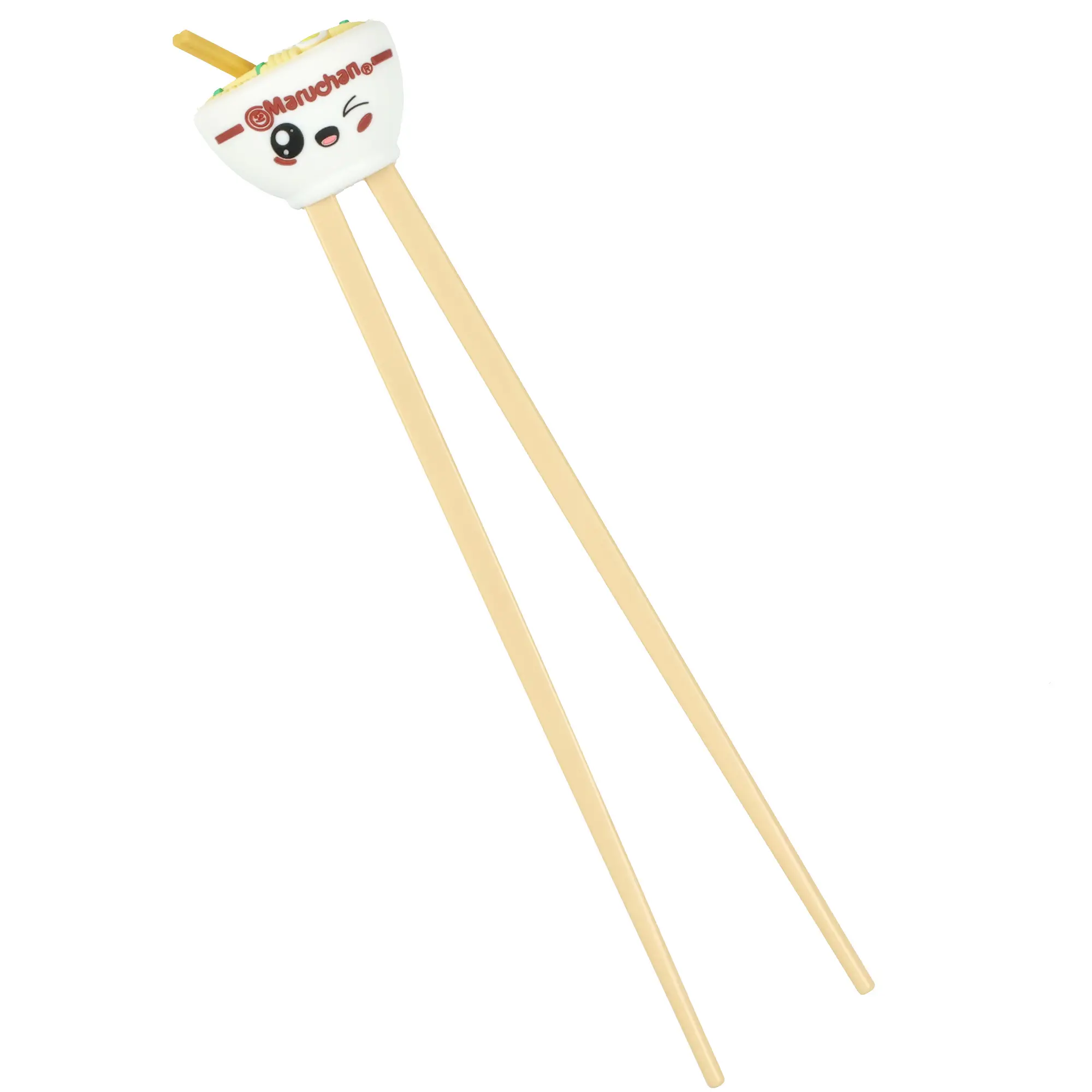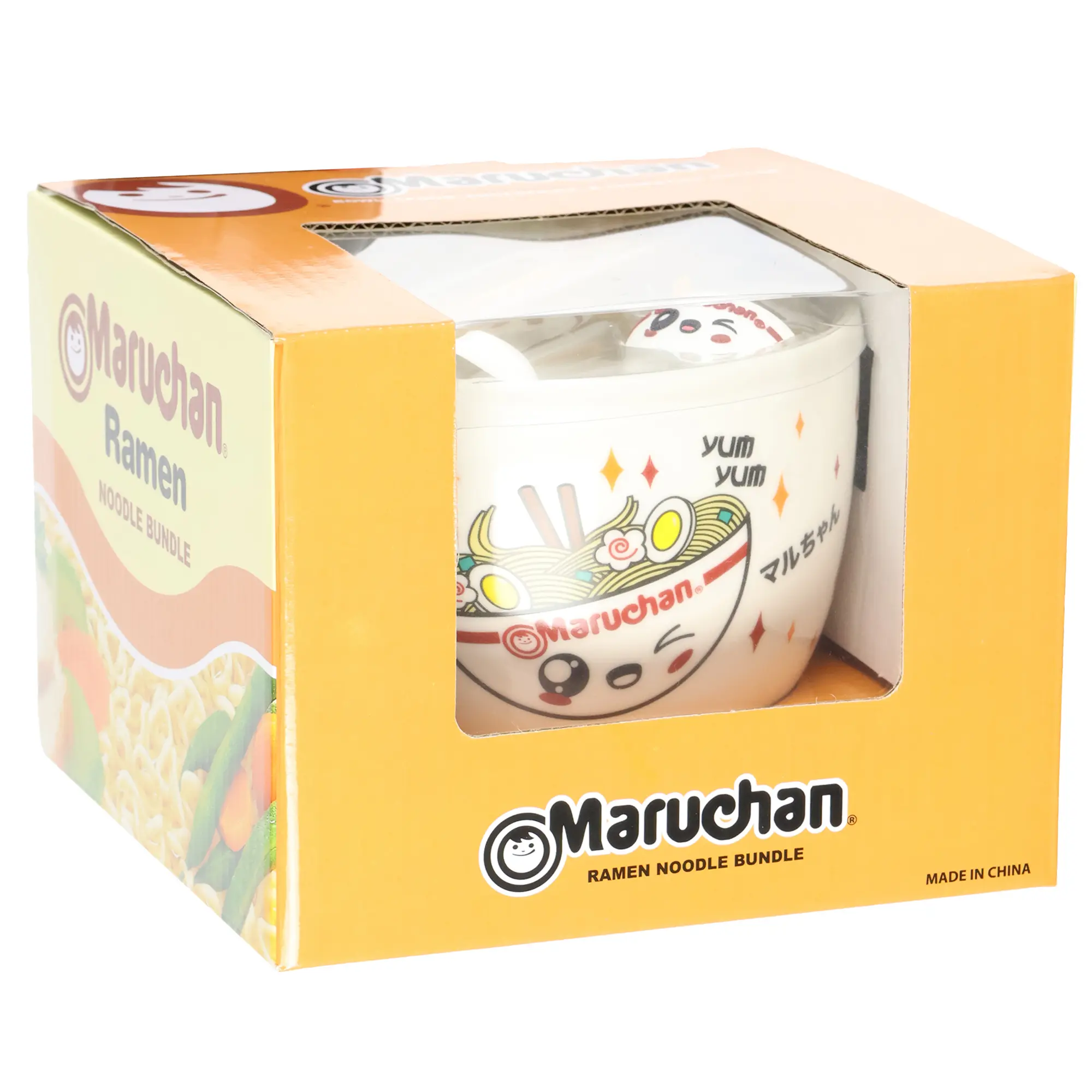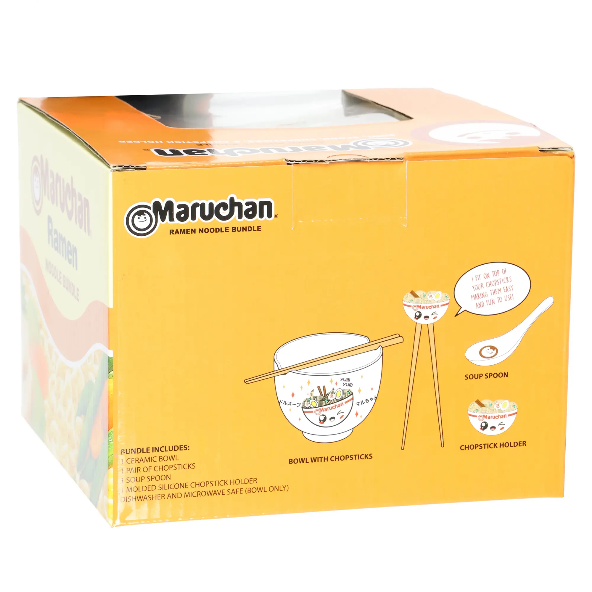 This Maruchan ramen bowl set combines charm and functionality in every piece. The ceramic bowl features a kawaii-style noodle cup graphic and has two side notches to rest your chopsticks between bites. The matching ceramic spoon complements the theme, and the two plastic chopsticks are easy to handle. A bonus rubber chopstick holder sits on top of your chopsticks for added grip, making it easier and more enjoyable to eat your favorite noodle dishes.