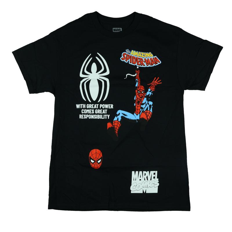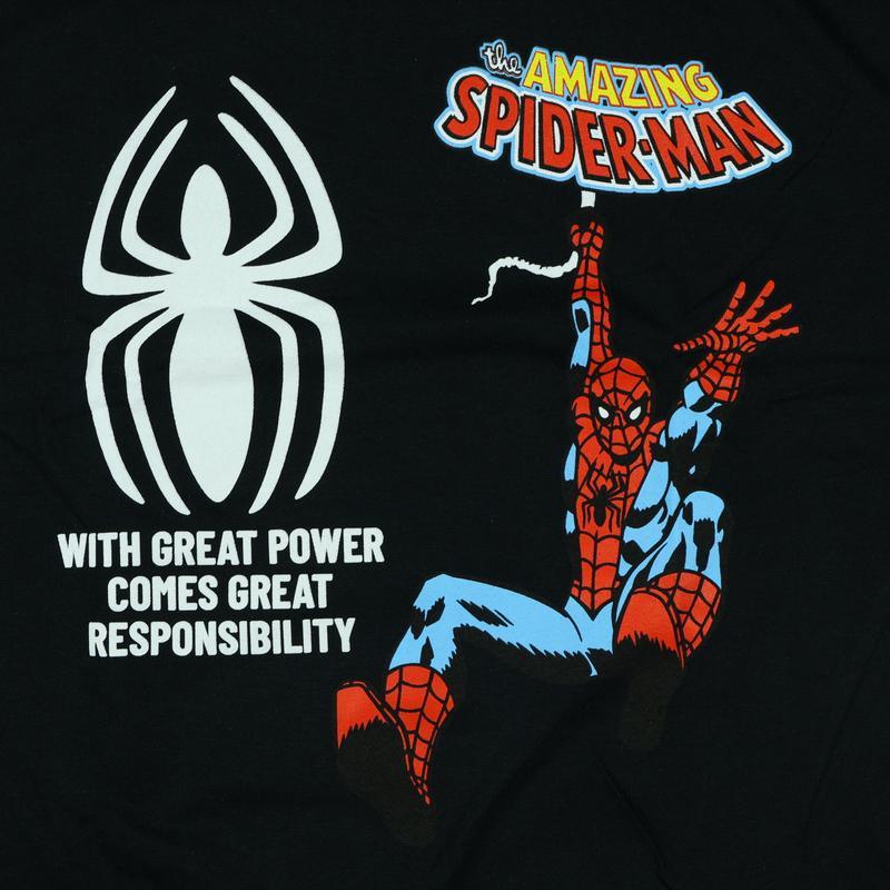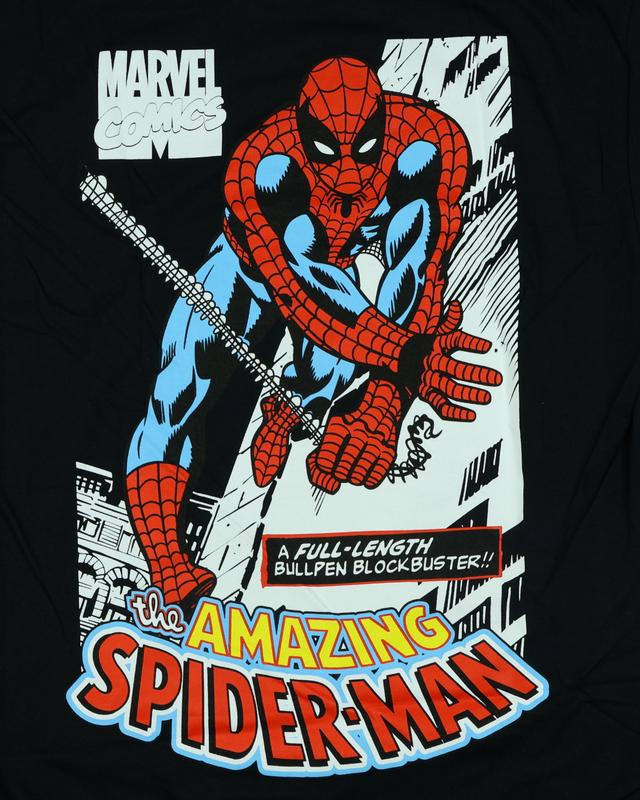 This men's Marvel Comics Spider-Man t-shirt delivers a bold double-sided design highlighting the wall-crawler in action. The front features layered artwork with Spider-Man swinging from the letters of "The Amazing Spider-Man," alongside minor details like the white chest logo, character close-up, and Marvel Comics branding. On the back, a large illustration shows Spider-Man swinging across a city skyline, with his costume in red and blue against a black-and-white background, framed by comic-inspired text. All-Day Comfort Fit: This men's tee is made from 100% cotton and offers breathable softness that holds up through everyday wear. The lightweight fabric helps keep you cool while providing a relaxed fit that moves with you. A tagless neckline reduces irritation, so you can focus on comfort without distractions. Detailed Front & Back Artwork: Unlike standard single-print designs, this shirt features graphics on both sides. The front displays multiple Spider-Man elements—including the white spider logo, character art swinging from bold letters, and Marvel Comics callouts—while the back showcases a whole comic-style scene of Spider-Man swinging across a city backdrop. The mix of color and black-and-white details sets it apart from typical superhero apparel. Durable Print Quality: The graphic is designed to maintain its sharp look through regular washes without heavy fading. With proper care—cold wash, tumble dry low, no bleach or ironing—the design stays vibrant, ensuring that Spider-Man's classic red-and-blue costume stands out against the black fabric base. Trusted Fabric Standards: This tee is constructed from standard cotton jersey fabric, widely recognized for durability and breathability. The material is easy to care for and tested for long-lasting wear, giving customers confidence in quality while minimizing shrinkage when laundered as directed. Versatile Comic Style: With bold character artwork and subtle logo details, this Spider-Man graphic tee pairs easily with jeans, shorts, or layered under a hoodie. It works as a daily wear staple for fans who want a comfortable shirt that balances style with recognizable Marvel Comics design.