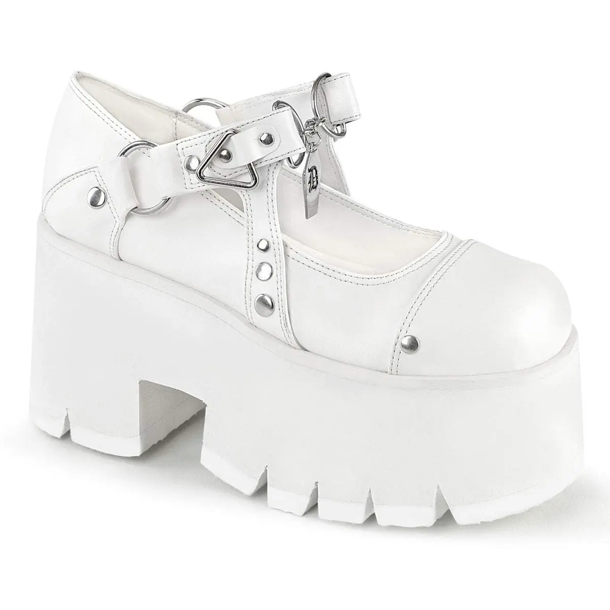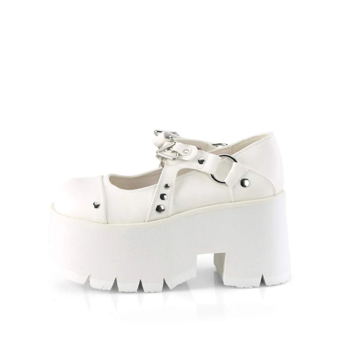 Step into a world of otherworldly style with the Ashes-33 Maryjane. These platforms come with a robust 3.5" heel and a daring 2.25" cut-out platform, perfect for those who love to tower above the ordinary. The shoe boasts a lavish white vegan leather upper, decorated with shimmering silver studs for a sleek, rebellious look. Not to be missed are the unique triangle and O-ring accents, centered by a coffin-shaped charm for an extra touch of gothic glam. Make the Ashes-33 the centerpiece of your outfit and embrace your unique style.