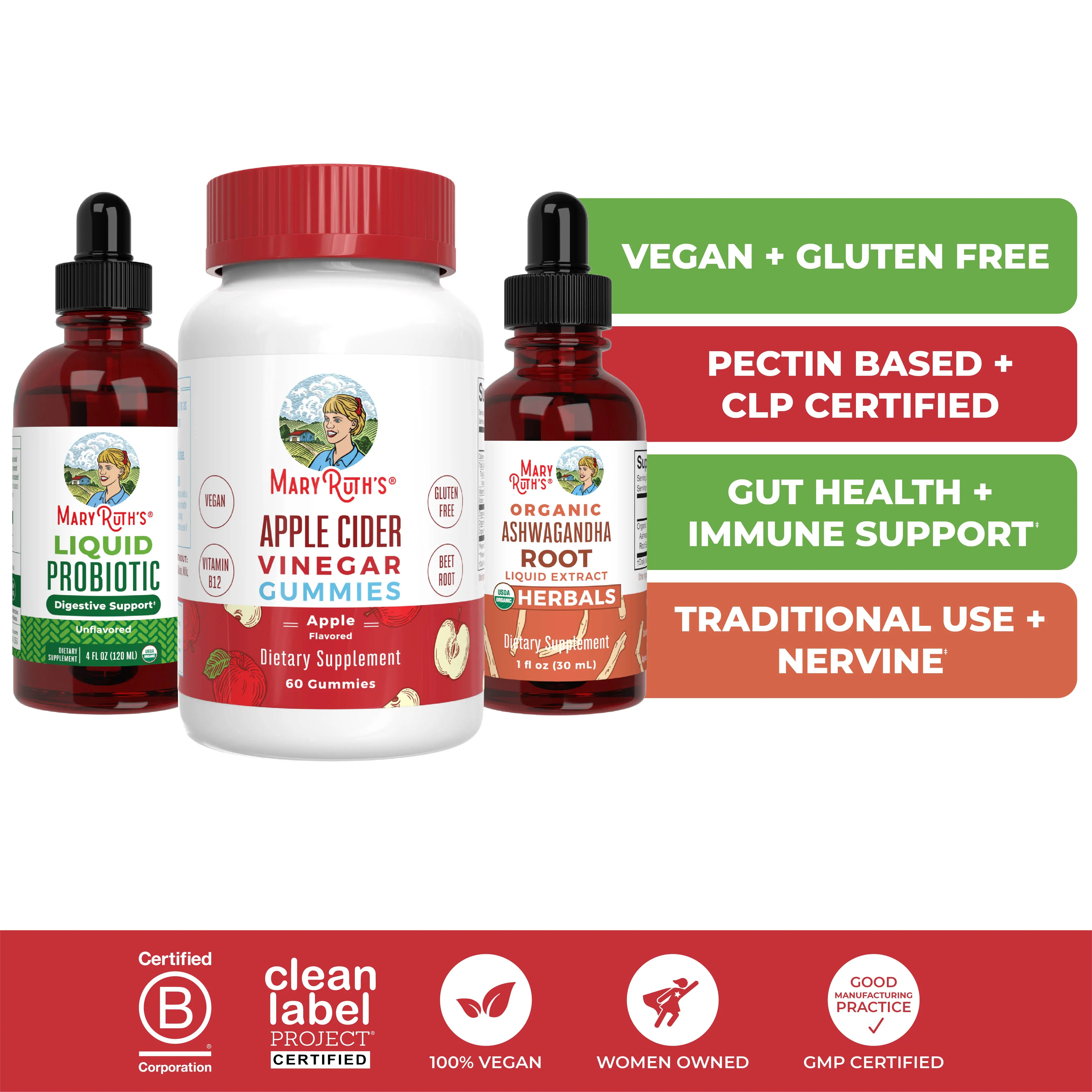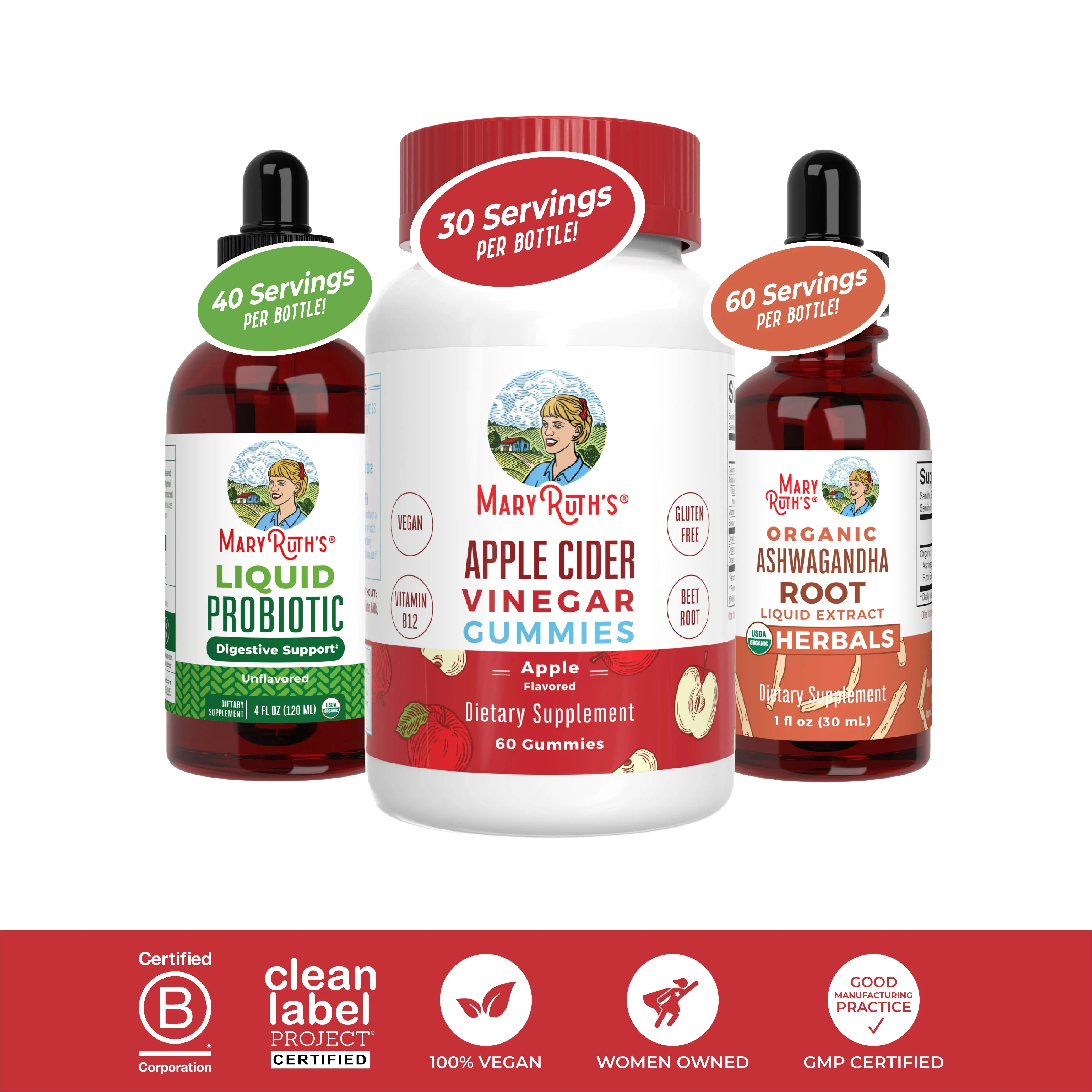 This wellness trio brings together three simple, supportive formulas you can reach for throughout your day. Our Apple Cider Vinegar gummies are made using raw, unfiltered apple cider vinegar and contain 500 mg of apple cider vinegar per serving! When you want to find calm with gentle herbal support, our Ashwagandha Root Drops may help to support healthy stress levels and support the body’s natural homeostasis. And for those moments where your gut needs extra care, our Liquid Probiotic Drops deliver 13 unique probiotic strains to support gut health, digestive health, immunity, and help reduce occasional gas and bloating — all in an easy-to-take, flavorless liquid. Together, these formulas give you options to choose from, each one made with care to help you move forward every day.