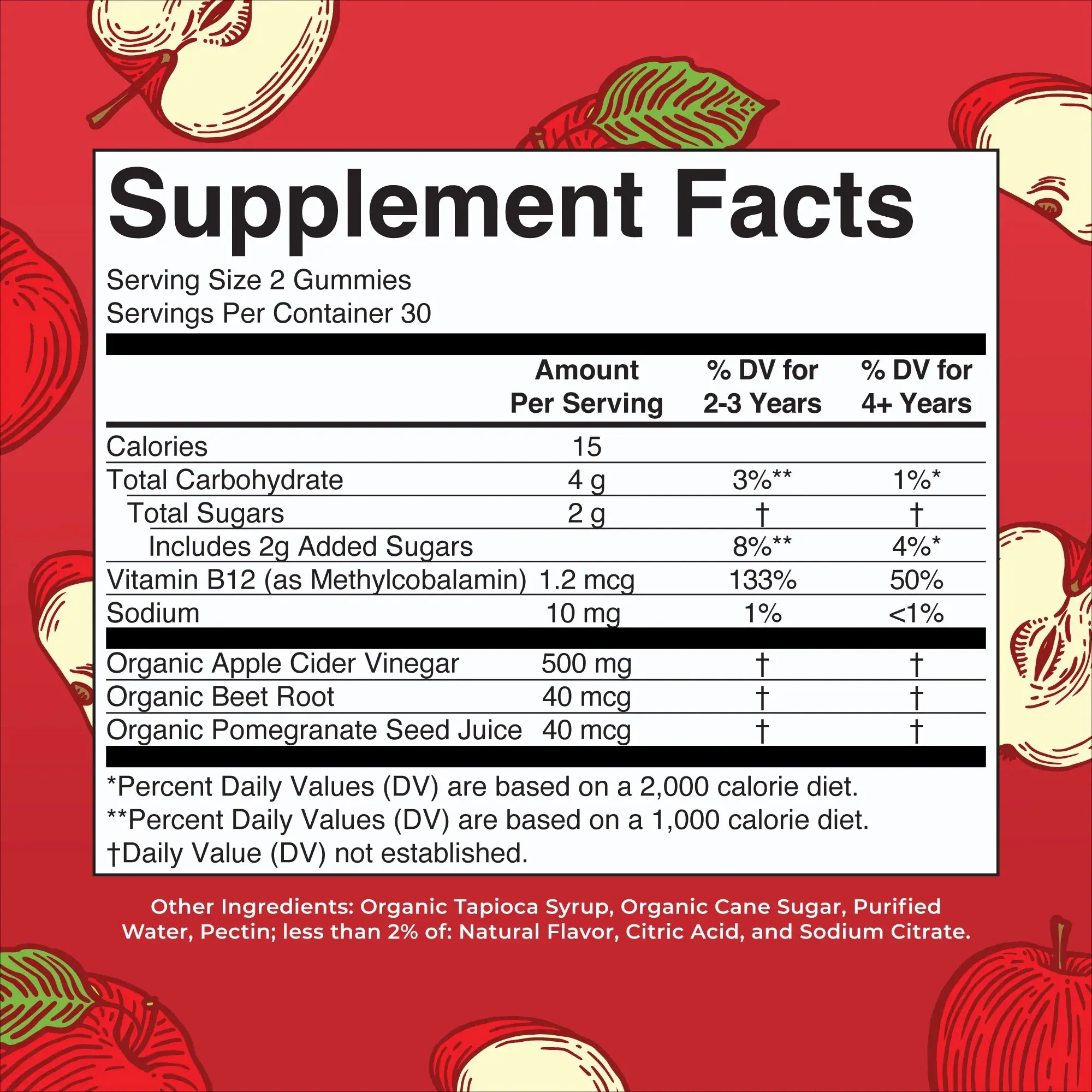 Delicious Vegan Gummies: Our ACV gummies contain B12 as methylcobalamin, which is bioavailable and may be the preferred form for many people who have the MTHFR gene variants! Enjoy two of these tasty apple-flavored gummies per day as a part of your wellness routine.