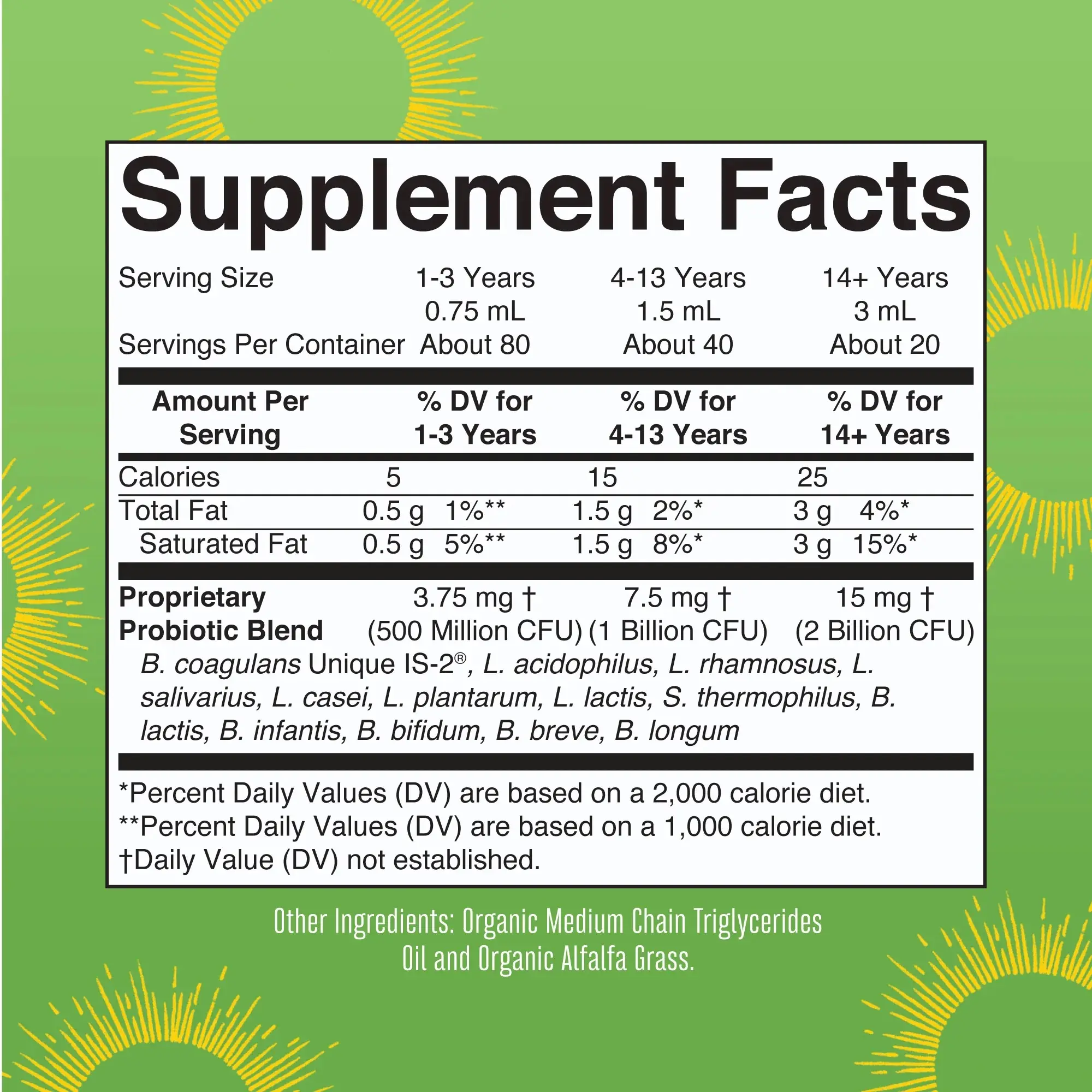 USDA Organic Liquid Probiotic: This vegan USDA Certified Organic Liquid Probiotic is formulated with 13 unique probiotic strains. This probiotic for men, women, and kids can easily be dosed for the whole family! This proprietary probiotic blend contains up to 2 billion CFU per serving.