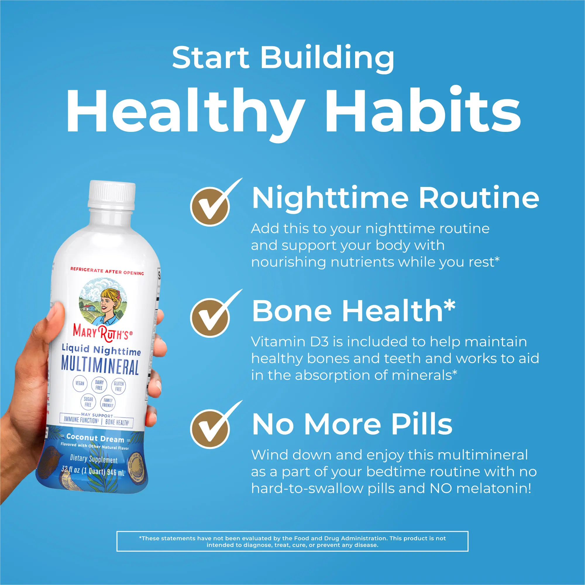 For Most Lifestyles: MaryRuth's Liquid Nighttime Multimineral is Non-GMO, Vegan, Made in a GMP Facility. Melatonin Free, Dairy Free, Gluten Free, Sugar Free. Formulated for Adults and Kids. Third Party Tested. Clean Label Project Certified. B Corp Certified.