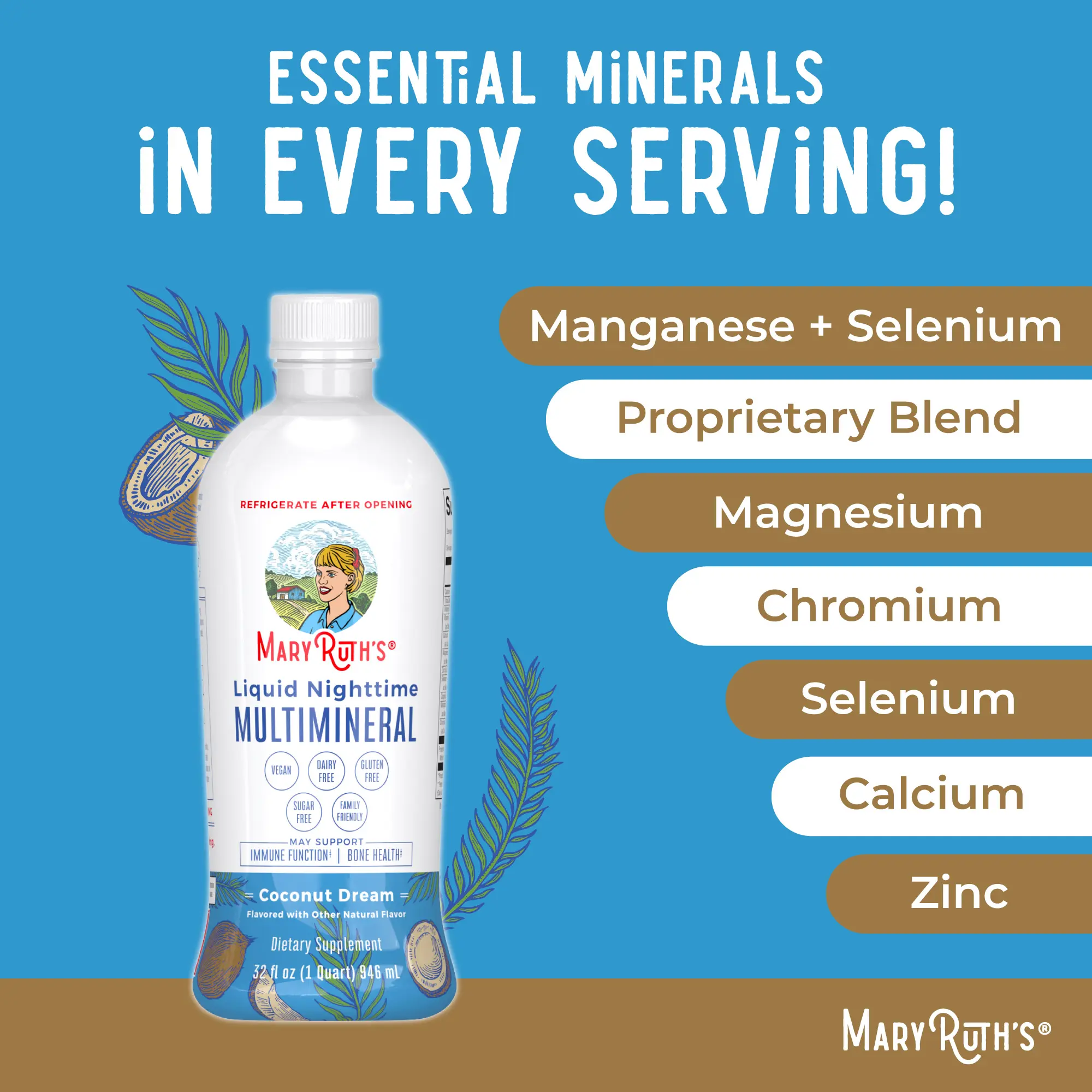 Vegan Bedtime Supplement: Our Liquid Nighttime Multimineral contains nine minerals ā magnesium, calcium, zinc, selenium, copper, manganese, and chromium ā in a delicious and easy-to-take liquid formula. Because our multimineral is liquid, itās easier to measure the proper amount for you and the rest of your family, even for children who may need a smaller dose.