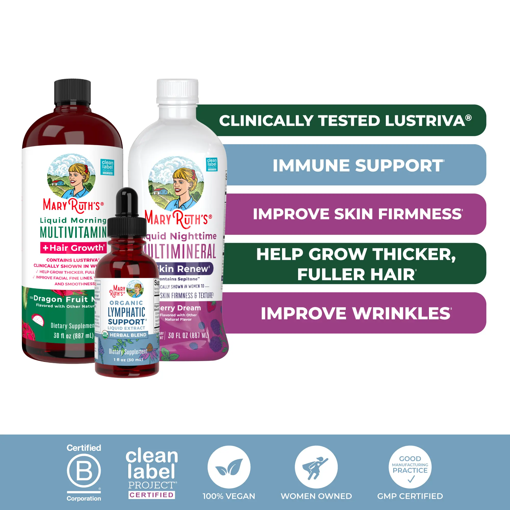 For Most Lifestyles: MaryRuth's Liquid Morning Multivitamin + Hair Growth is Vegan, Dairy Free, Gluten Free, Nut Free, Sugar-Free, and Made in a GMP Facility. Third Party Tested. Clean Label Project Certified. B Corp Certified.