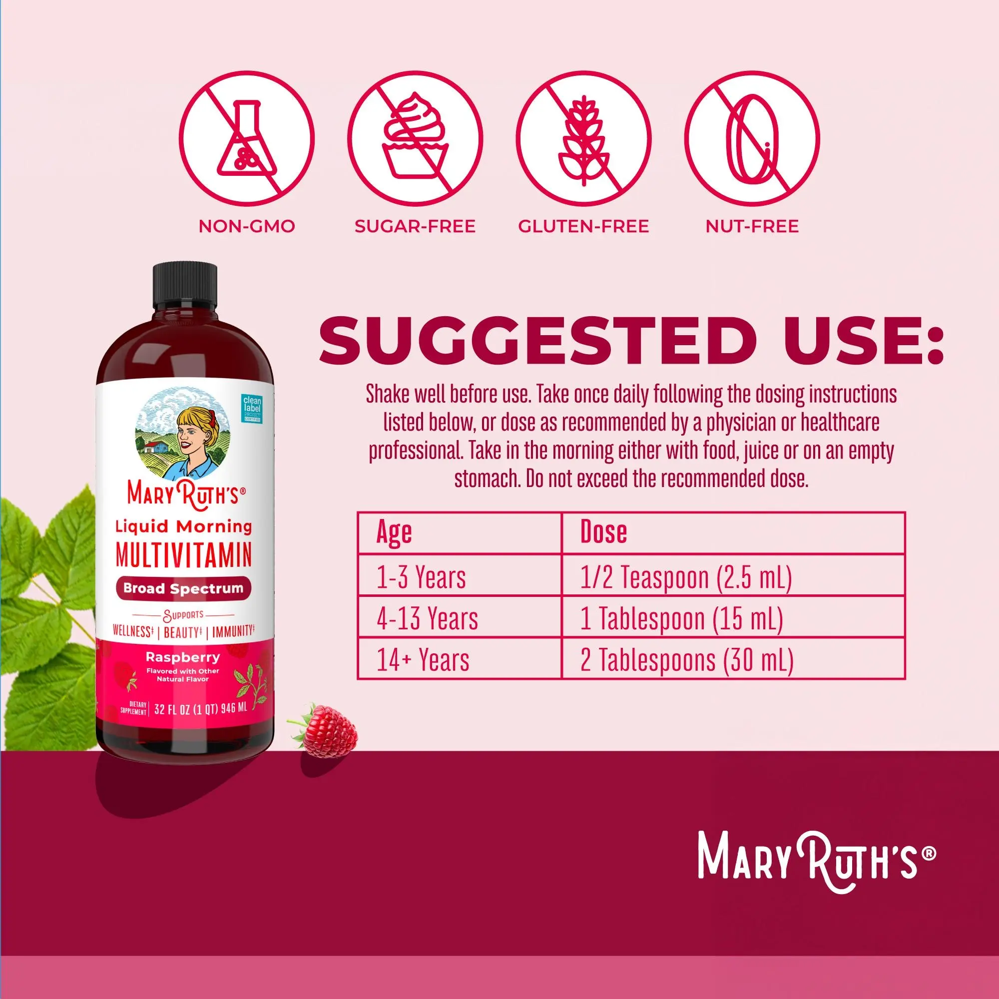 Liquid Daily Multivitamin: Support your body’s nutrient needs, all with no hard-to-swallow pills. MaryRuth’s delicious Raspberry Liquid Morning Multivitamin is an easy-to-take liquid with minerals, amino acids, and multiple essential vitamins including antioxidant vitamin C, vitamin D, vitamin E, and beta carotene.