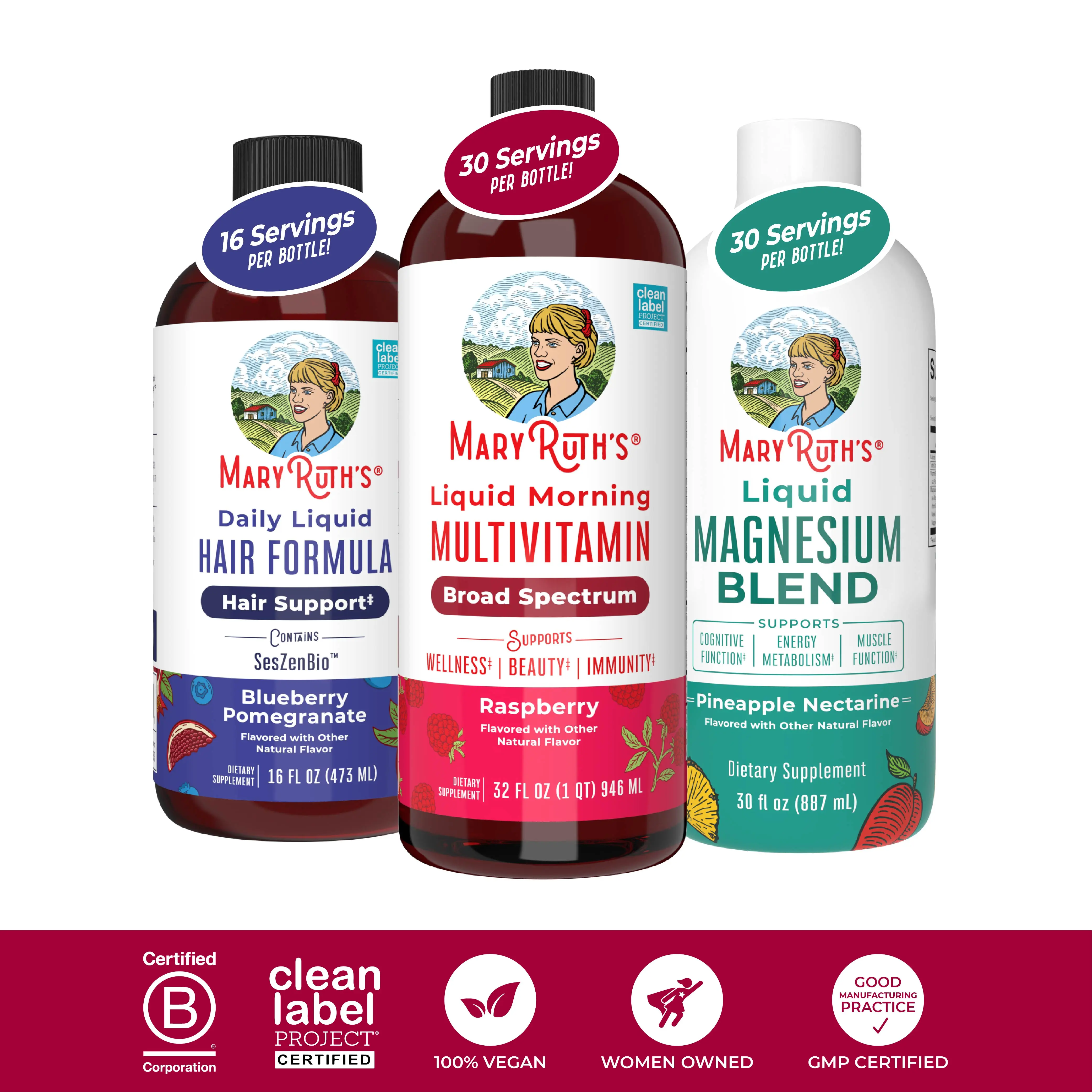 For Most Lifestyles: MaryRuth's Liquid Morning Multivitamin is Non-GMO, Vegan, Dairy Free, Nut Free, Gluten Free, Sugar Free. Each bottle comes with 30-32 servings. Third Party Tested. Clean Label Project Certified. B Corp Certified. Women Owned.