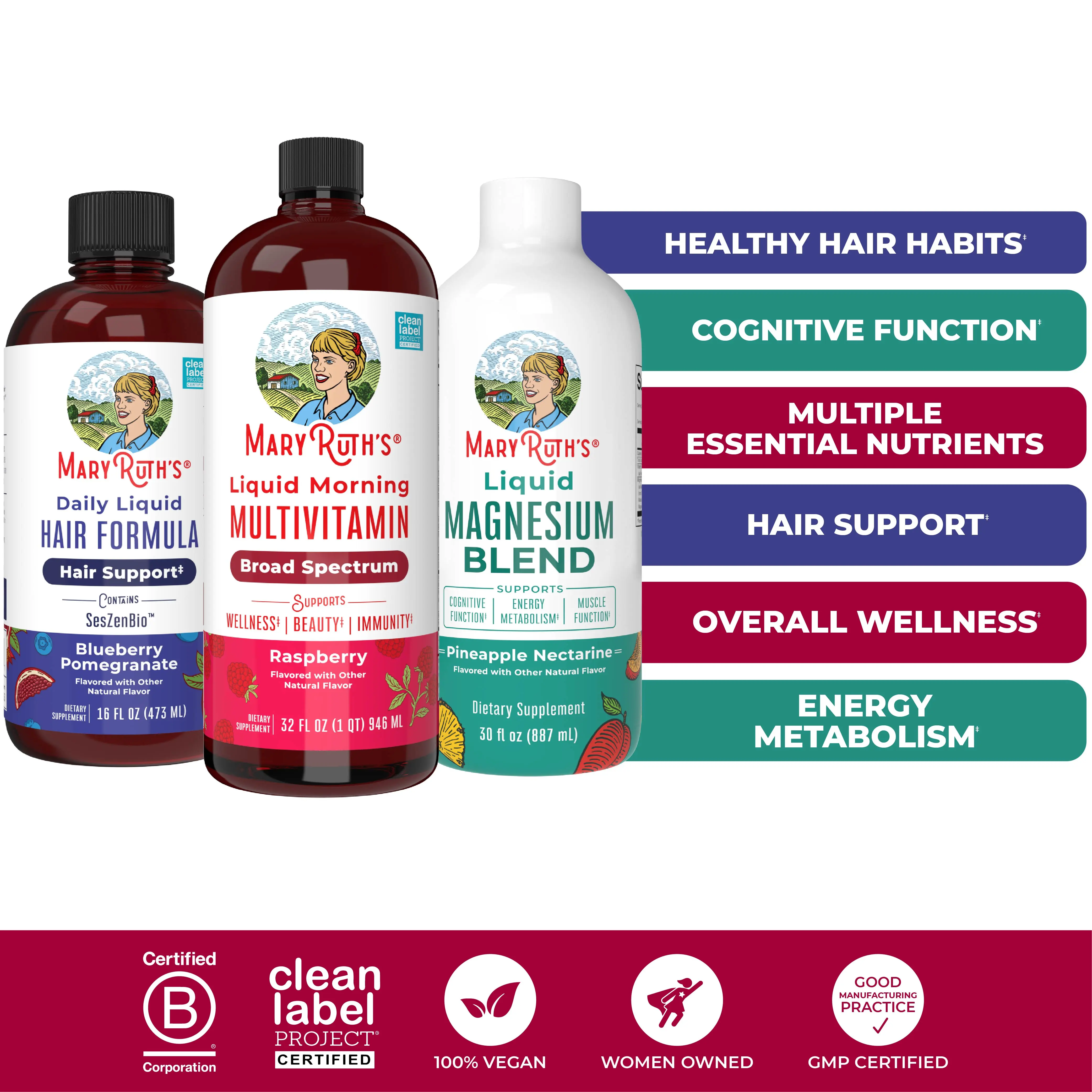 Start your day with this MaryRuth’s wellness bundle that supports you from the inside out! Our best selling raspberry-flavored Liquid Morning Multivitamin is the very first product MaryRuth ever created and is made for the whole family, with essential nutrients to support energy metabolism, immunity, bone health, and more. Our sweet and tart Daily Liquid Hair Formula comes in a delicious blueberry pomegranate flavor, featuring SesZenBio to support thicker, stronger hair in women. To round out your routine, our tasty Liquid Magnesium is formulated with a unique triple complex blend of magnesium to support energy metabolism, electrolyte balance, muscle function, and more! Together, these essentials create a simple and enjoyable routine that fits easily into even the busiest days.