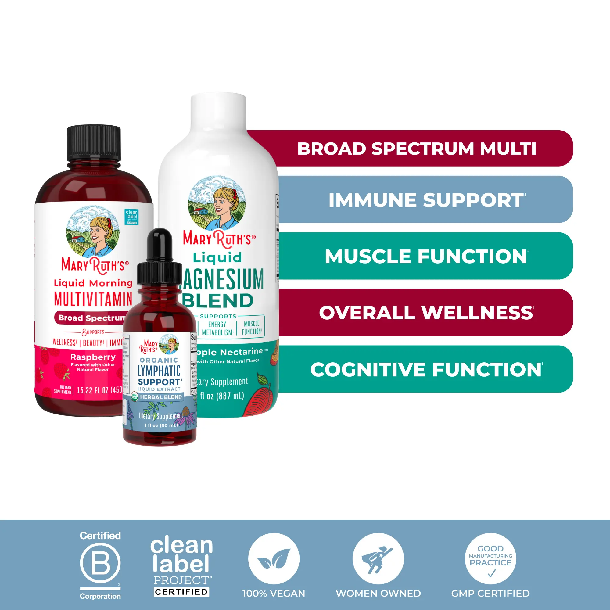 Support your overall wellness, lymphatic system, and magnesium levels with this Daily Multivitamin, Lymphatic Support, & Magnesium Bundle! The very first product MaryRuth ever created, and still a best seller, our delicious Liquid Morning Multivitamin is made for the whole family, with essential nutrients to support energy metabolism, immunity, bone health, and more! To complement your routine with essential mineral magnesium, our Liquid Magnesium Blend comes in a delicious, pineapple nectarine flavor and supports energy metabolism, brain function, electrolyte balance, plus more. And to round out your routine, our Lymphatic Support Herbal Blend features a synergistic combination of herbs, including Echinacea purpurea Root, European Elder Berry, Plantain Leaf, and more to support your lymphatic system.