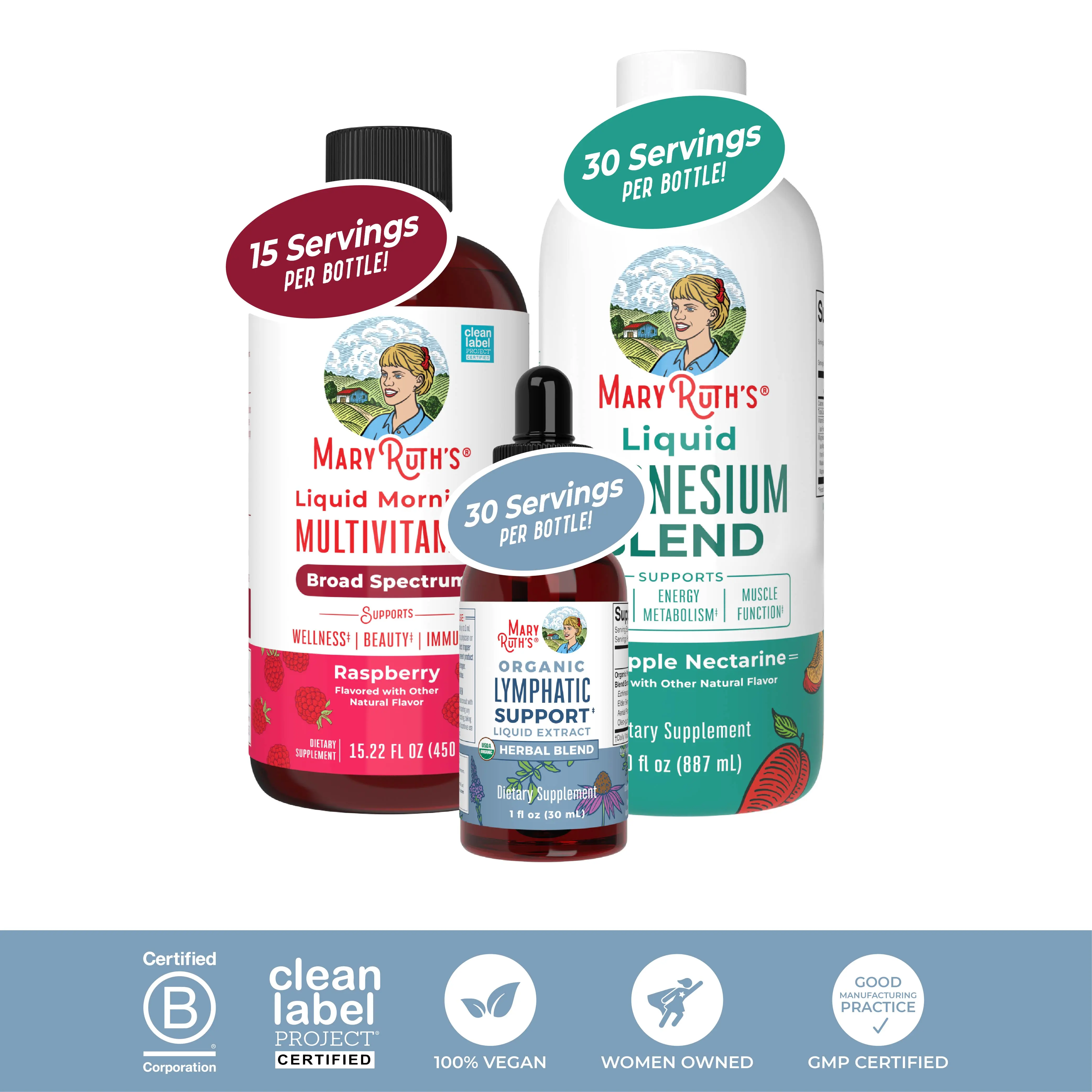 For Most Lifestyles: MaryRuth's Liquid Morning Multivitamin is Non-GMO, Vegan, Dairy Free, Nut Free, Gluten Free, Sugar Free. Each bottle comes with 15 servings. Third Party Tested. Clean Label Project Certified. B Corp Certified.