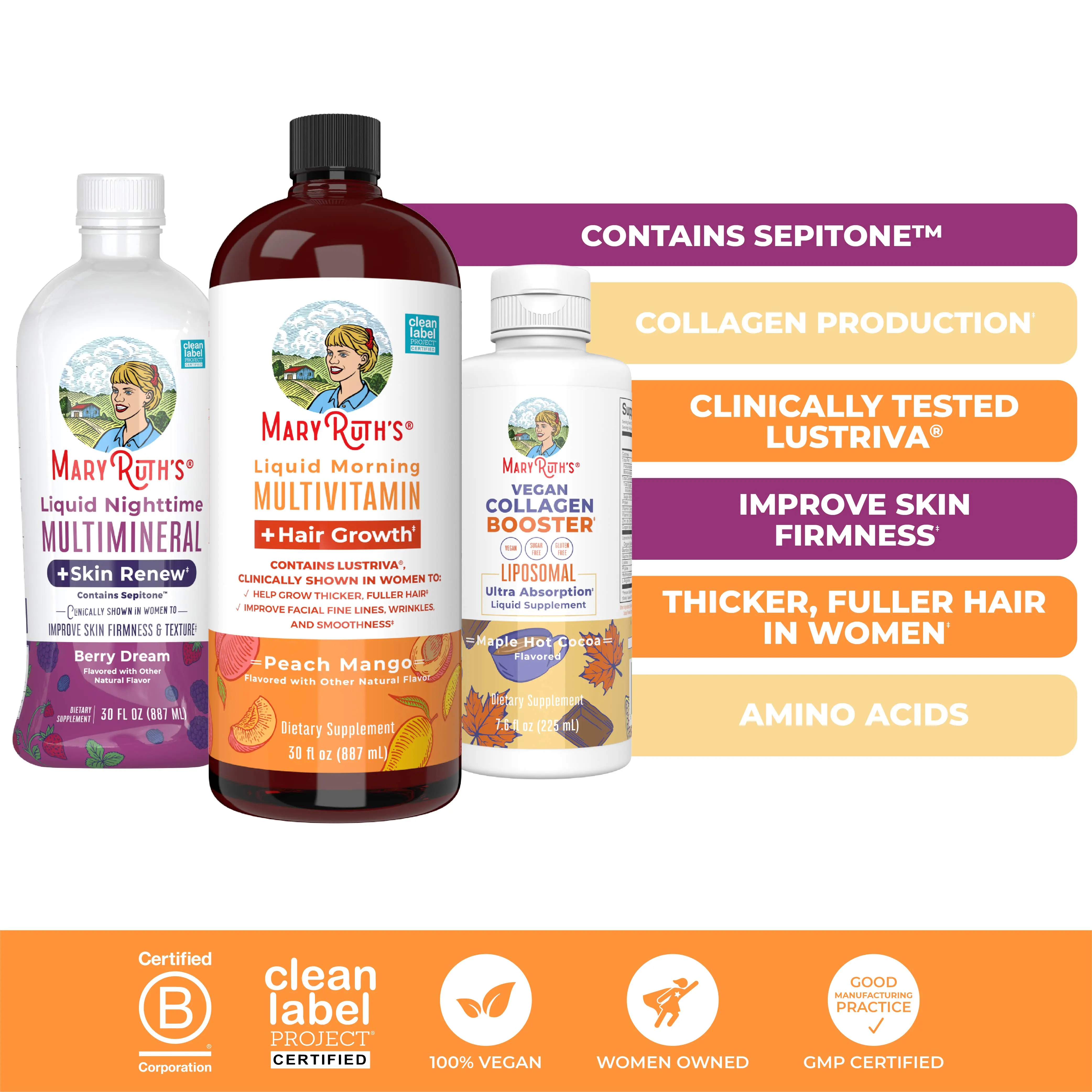 For Most Lifestyles: MaryRuth's Liquid Morning Multivitamin + Hair Growth is Vegan, Dairy Free, Gluten Free, Nut Free, Sugar-Free, and Made in a GMP Facility. Third Party Tested. Clean Label Project Certified. B Corp Certified.
