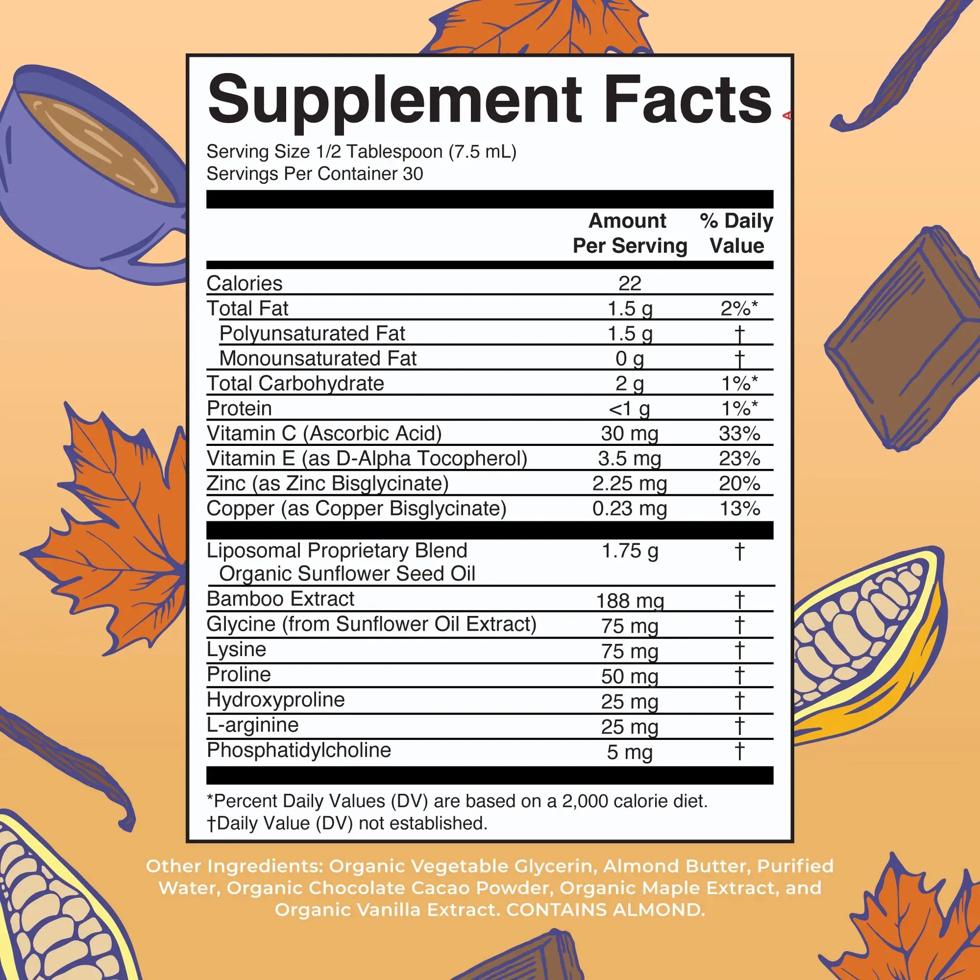Important Nutrients: Vitamin C maintains normal collagen production, which supports connective tissue formation. Essential minerals copper and zinc also help support skin health. In addition to these ingredients, our Collagen Booster Liposomal also contains bamboo extract, lysine, glycine, proline, hydroxyproline, L-arginine, and phosphatidylcholine.