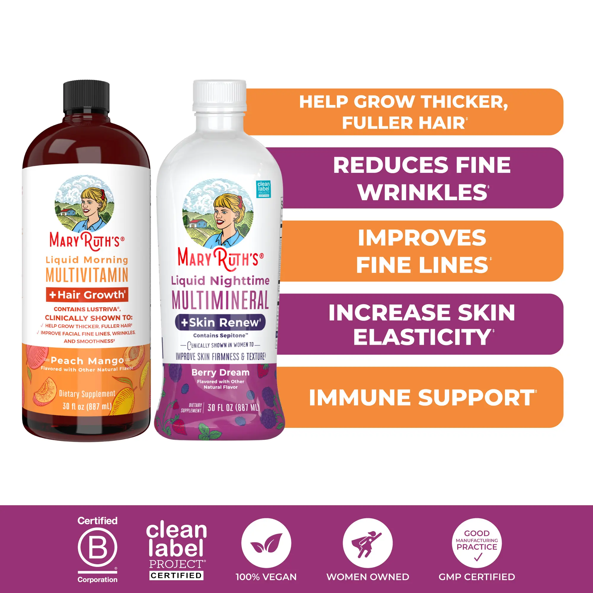 For Most Lifestyles: MaryRuth's Liquid Morning Multivitamin + Hair Growth Multivitamin is Vegan, Dairy Free, Gluten Free, Nut Free, Sugar-Free, and Made in a GMP Facility. Third Party Tested. Clean Label Project Certified. B Corp Certified.