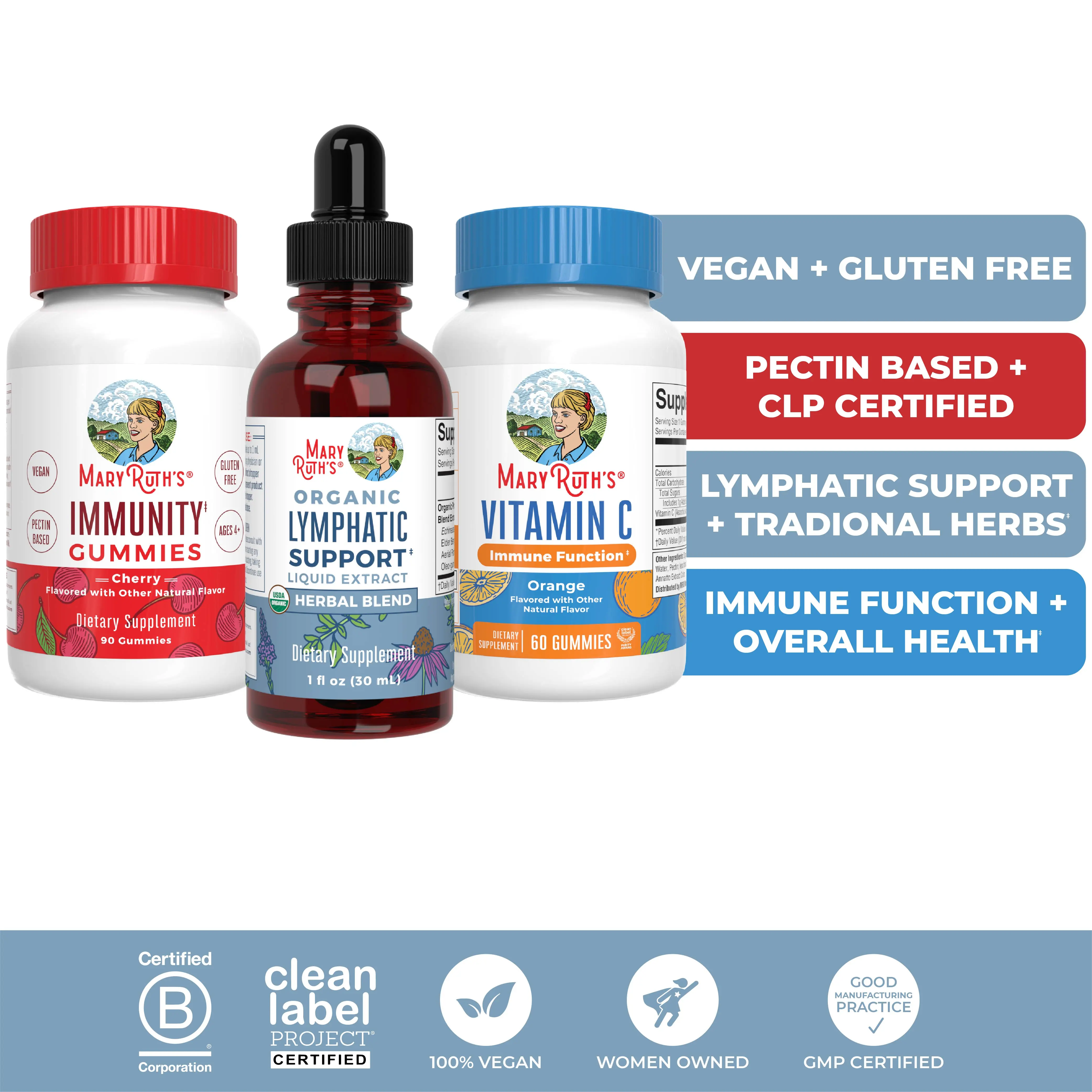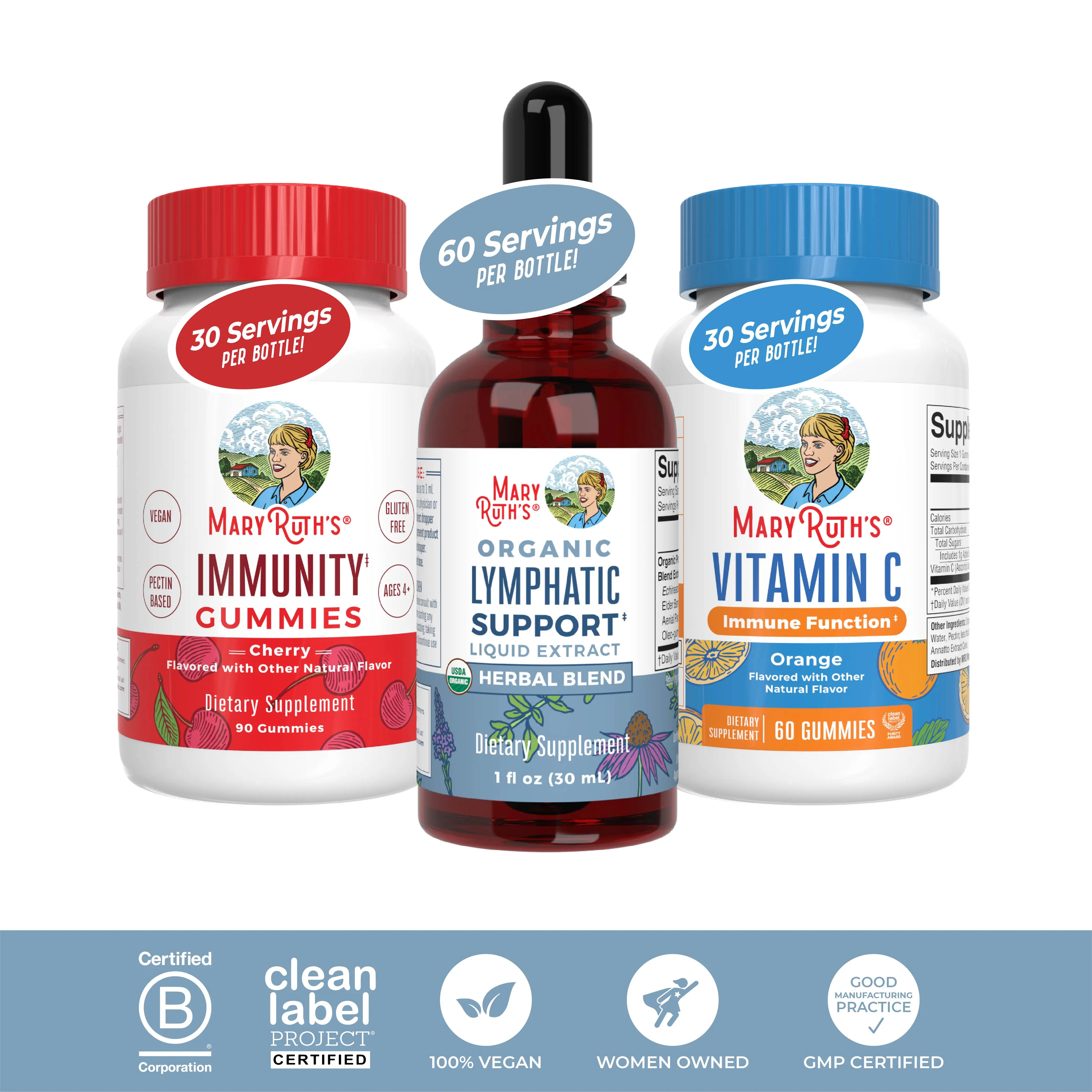 Give your wellness routine a little extra support with the trio of MaryRuth’s favorites. Our Immunity Gummies provide essential nutrients, including vitamins C and D, plus zinc, to support your immune system. With a delicious cherry flavor, these gummies make daily immune support simple and enjoyable for the whole family. Our bright, citrusy Vitamin C Gummies add an easy-to-take dose of antioxidant support to your day. And our smooth, herbal Lymphatic Support Liquid Drops mix easily into water or your favorite beverage to support your lymphatic system with an herbal blend featuring Echinacea purpurea Root, European Elder Berry, and more. This immunity and lymphatic support bundle makes it easy to support your overall wellness each day.
